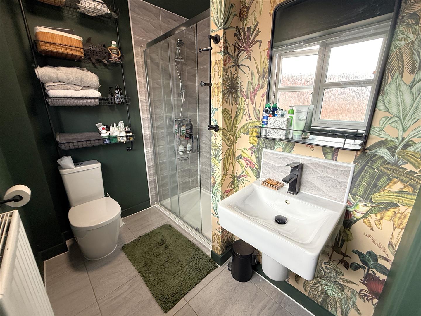 Ensuite Shower Room - 1.98m max into shower x 2.18m max (6'6" max into s - An L shaped ensuite fitted with contemporary fixtures and fittings, having double width shower enclosure with sliding glass screen and wall mounted shower mixer, close coupled WC and half pedestal washbasin with mixer tap and tiled splash backs, central heating radiator and double glazed window to the front.