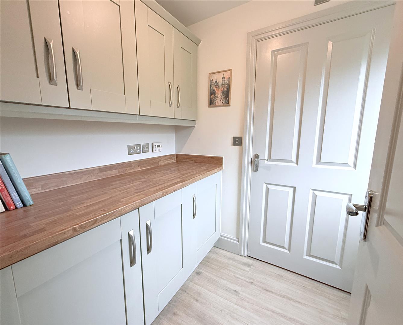 Utility Room - 1.80m x 1.73m (5'11 x 5'8) - Fitted with a generous range of storage with wall and base units complementing the main kitchen, butchers block effect preparation surface, under counted integrated washing machine, central heating radiator, double glazed exterior door into the garden.