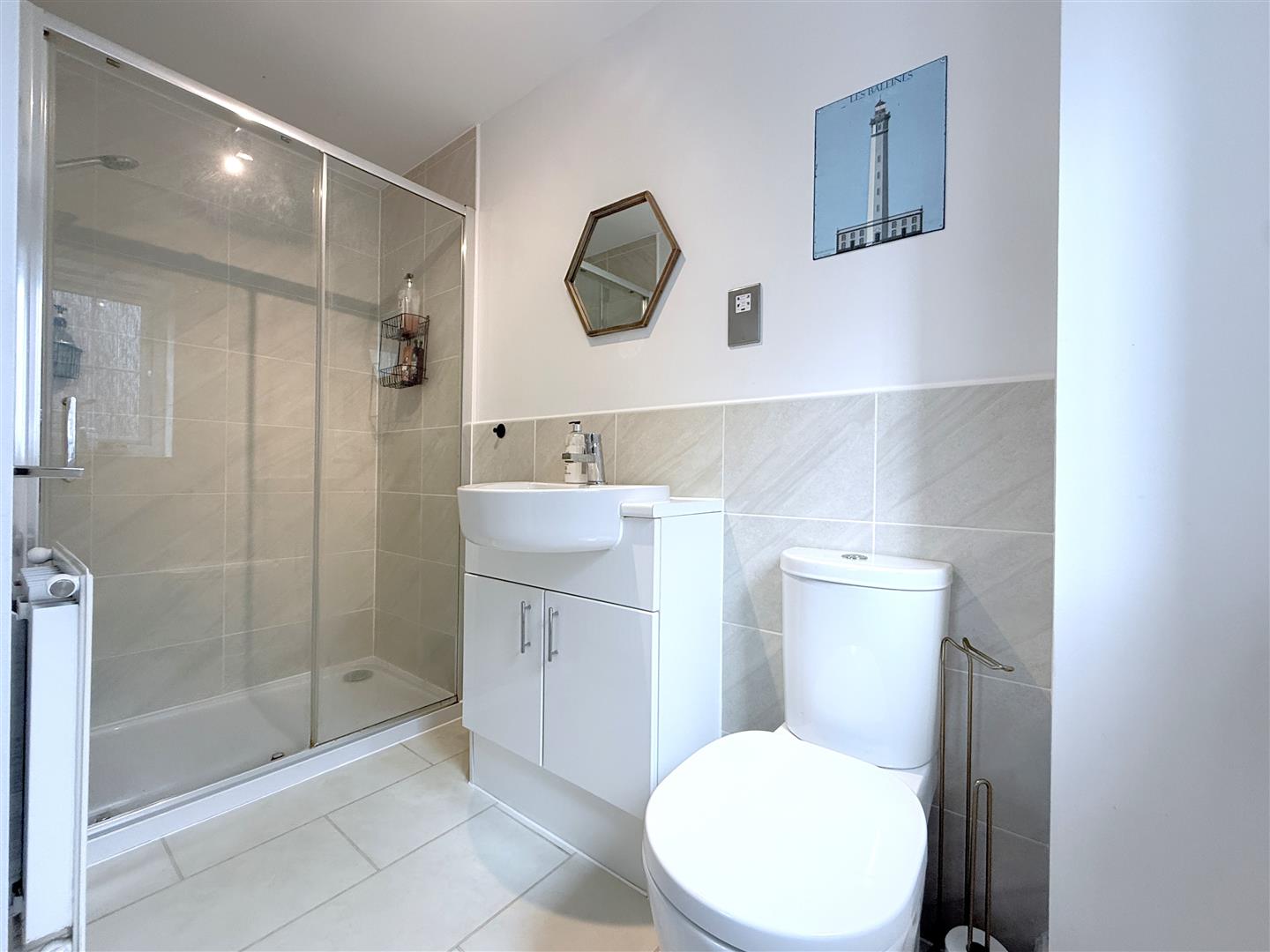 Ensuite Shower Room - 2.74m into shower x 1.17m min (1.78m max) (9'0 int - An L-shaped shower room having a contemporary suite comprising of double width shower enclosure with sliding glass screen, wall mounted shower mixer with independent handset over, close coupled WC, vanity unit with inset wash basin and chrome mixer tap, central heating radiator, double glazed window.