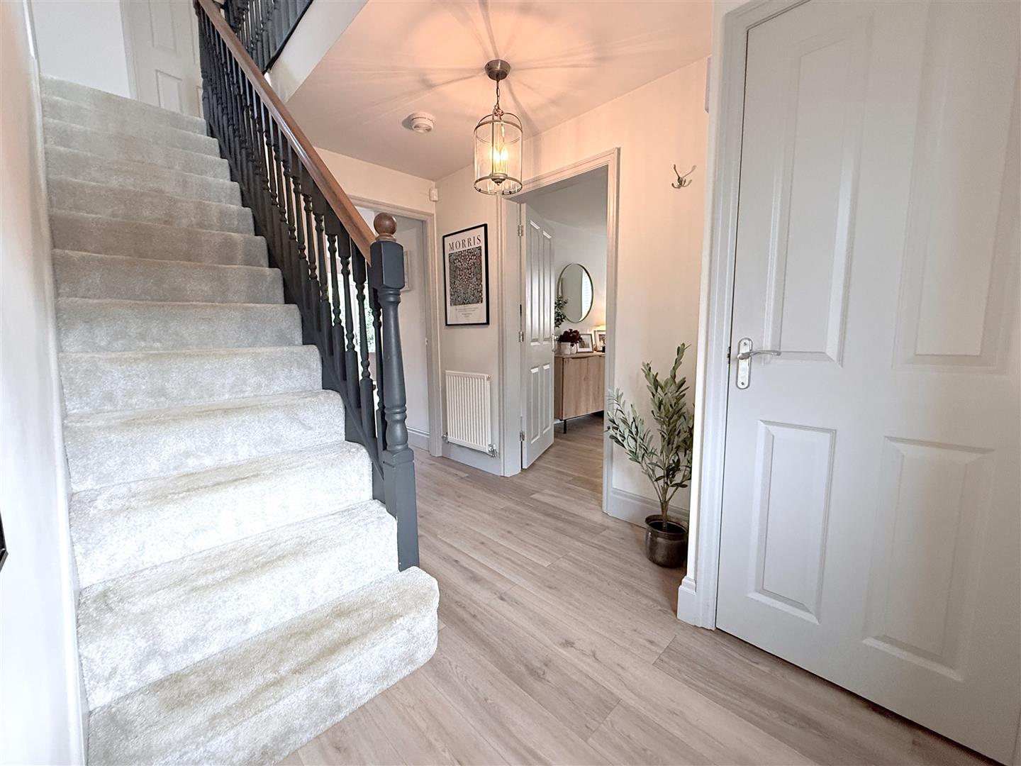The property was originally completed to the popular Halstead design which offers an excellent level of accommodation boasting four double bedrooms, the master benefitting from fitted wardrobes and ensuite facilities, in addition there is a contemporary bathroom. To the ground floor is a well proportioned sitting room with attractive walk-in bay window, and the heart of the home being in the superb open plan living dining kitchen with feature walk-in bay window and French doors leading out into the landscaped rear garden. The kitchen is tastefully appointed with a generous range of units and integrated appliances and large enough to accommodate both living and dining areas. In addition there is a utility and ground floor cloakroom.