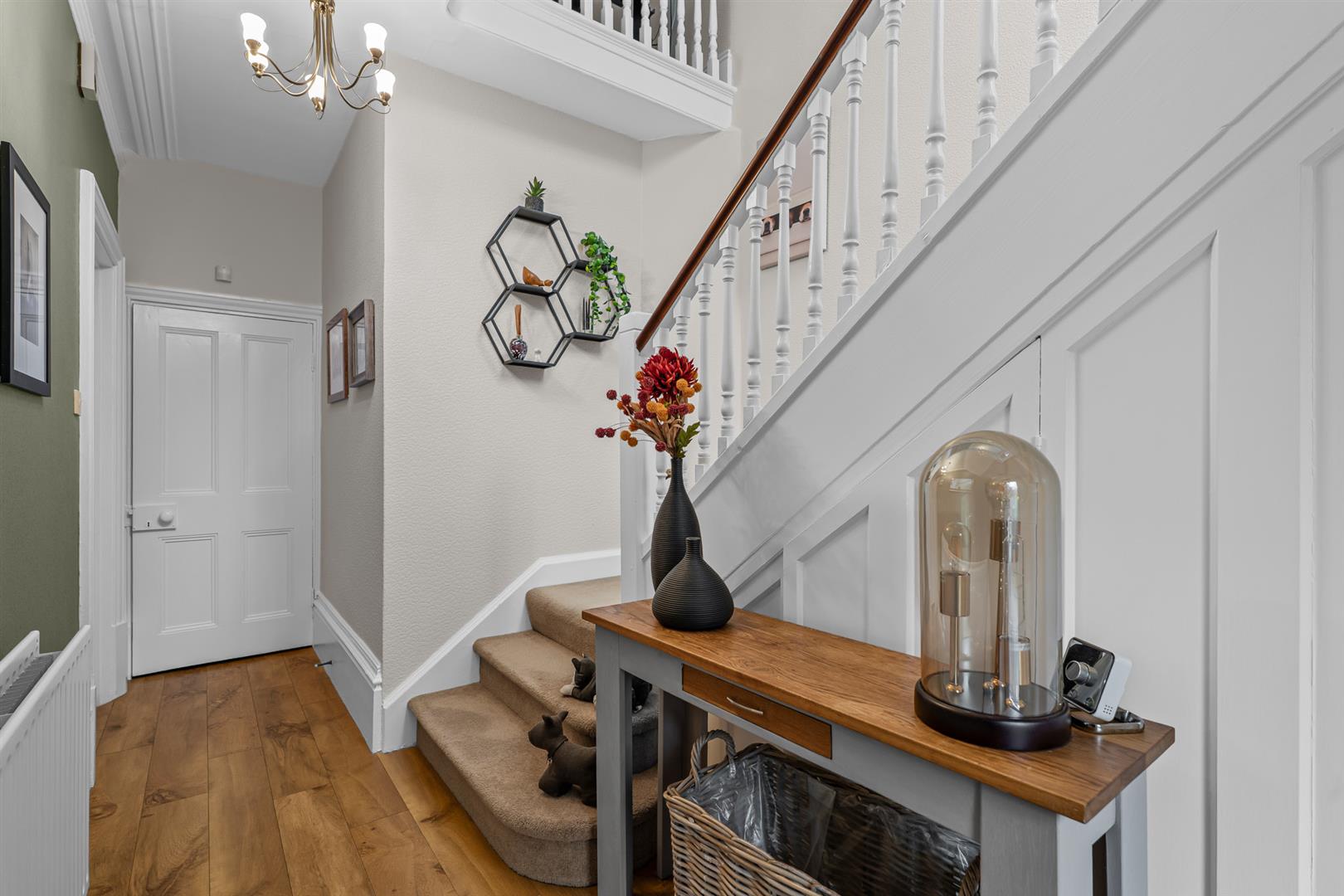 Main Entrance Hall - 5.56m x 2.49m max into stairwell (18'3" x 8'2" max - An attractive initial entrance vestibule having a high deep corniced ceiling, spindle balustrade staircase rising to the first floor with useful under stairs storage cupboard beneath, oak effect flooring, deep skirtings and architrave, useful built in cloaks cupboard and further doors leading to: