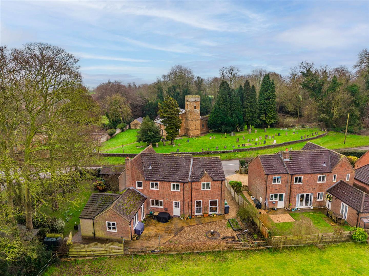 The gardens runs to all sides with the rear garden landscaped to provide relatively low maintenance living, having a gravelled and paved terrace which links back into the main sitting room. This area of the garden affords fantastic views across adjacent paddocks and links round into a more established area of the garden with a central lawn, mature trees and a pleasant aspect across to the village church.
