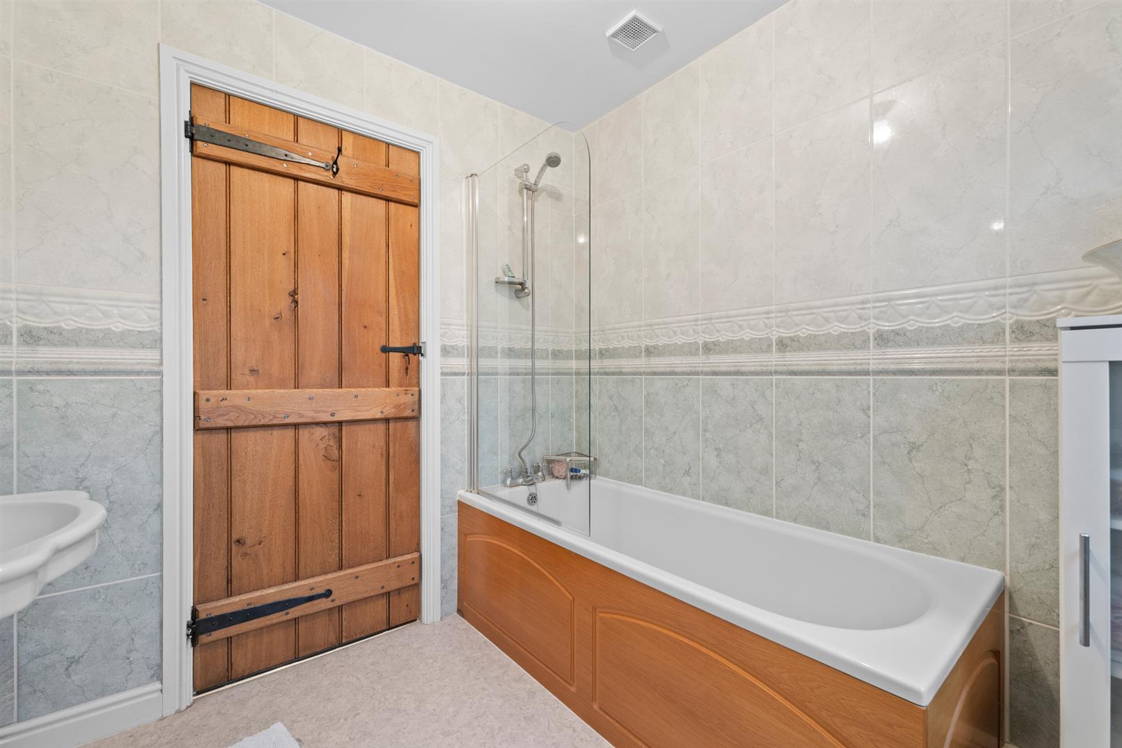 Bathroom - 2.26m x 2.24m (7'5" x 7'4") - Having a three piece suite comprising panelled bath with chrome mixer tap with integral shower handset and glass screen, close coupled WC and pedestal washbasin; fully tiled walls, chrome towel radiator and double glazed window with far reaching views.