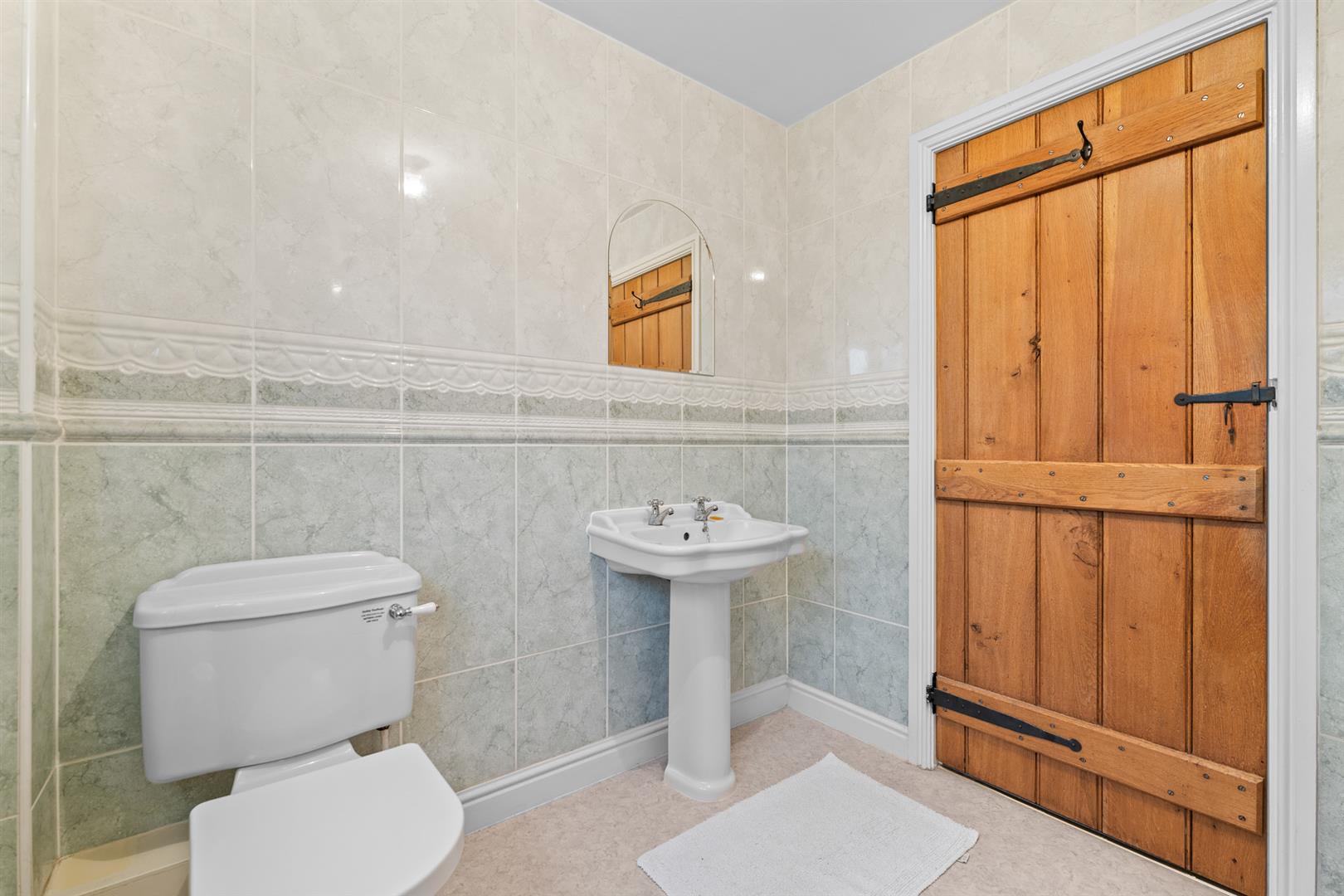 Ground Floor Cloak Room - 2.01m x 0.91m (6'7" x 3') - Having a two piece white suite comprising close coupled WC and wall mounted washbasin with tumbled marble tiled splash backs and double glazed window to the rear.