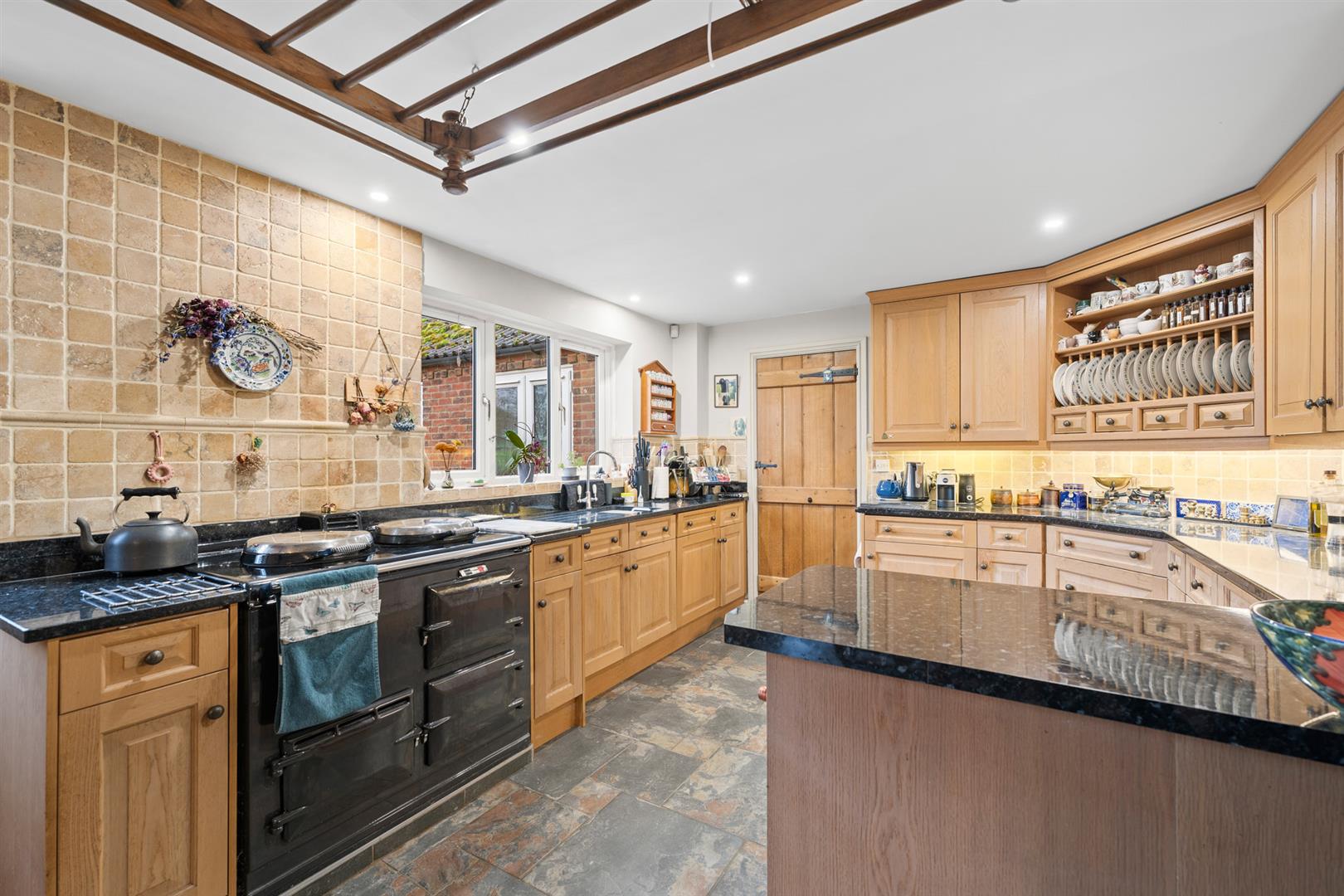 Kitchen - 5.56m x 3.40m (18'3" x 11'2") - A well proportioned space which in turn opens out into a living/dining area which combined creates an open plan everyday living/entertaining space ideal for families. The initial kitchen is tastefully appointed with a generous range of bespoke wall, base and drawer units with central dresser unit with plate rack and shelving above and under-unit lighting; granite preparation surfaces with undermounted sink with chrome swan neck mixer tap and tumbled marble tiled splash backs; a floor standing Aga range providing an attractive focal point; integrated dishwasher and space and plumbing for free standing fridge freezer. The kitchen affords a delightful aspect across the paddocks beyond with a stable door leading into the rear garden.