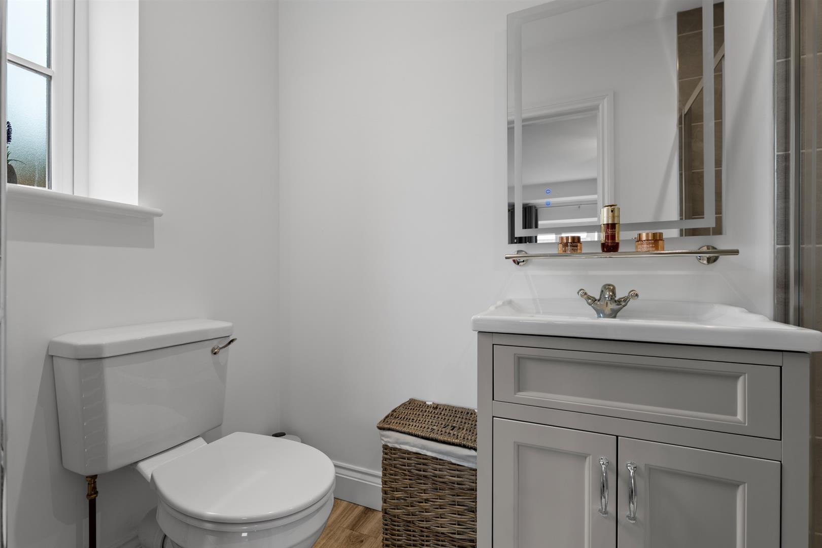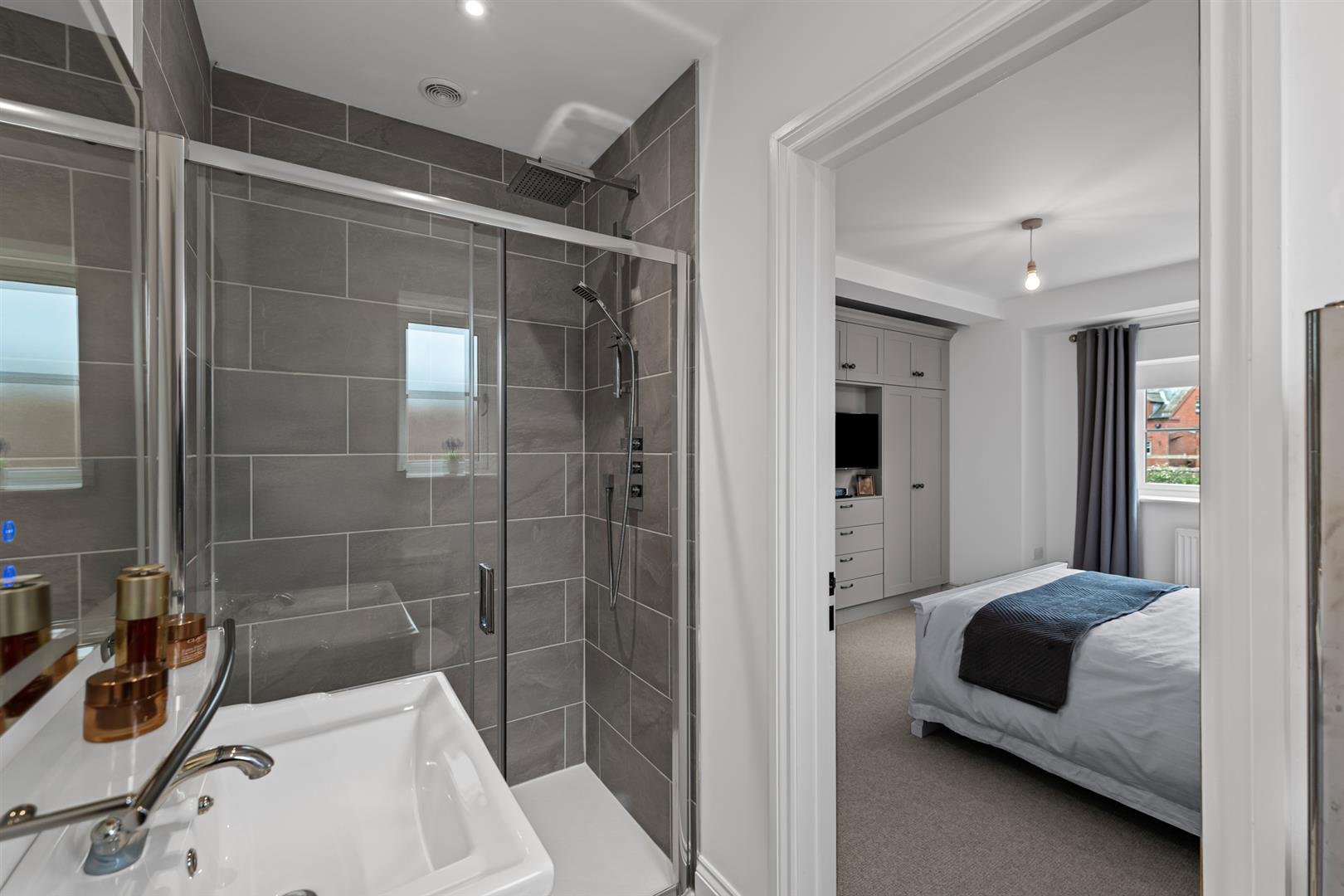 Ensuite Shower Room - 2.57m x 1.19m (8'5" x 3'11") - Beautifully appointed with a three piece suite with both traditional and contemporary elements comprising double width shower enclosure with sliding glass door and flush wall mounted shower mixer with both independent handset and rainwater rose over, two piece heritage style suite with close coupled WC and vanity unit with inset washbasin with chrome mixer tap and LED mirror above, deep skirtings, contemporary towel radiator and double glazed window to the side.