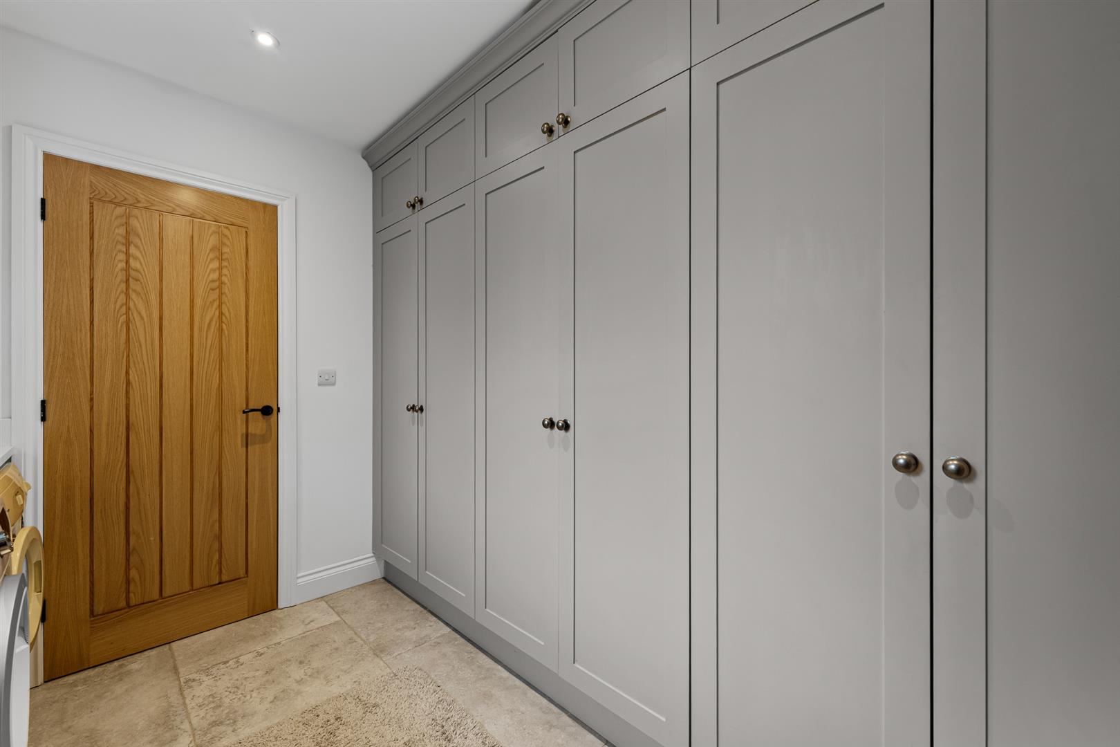 Utility Room - 3.02m x 2.39m (9'11" x 7'10") - Fitted with a particularly generous range of storage complementing the main kitchen units, having built in cloaks and larder cupboards with overhead storage, addition base and drawer units, quartz work surface with undermounted ceramic sink with brush metal swan neck mixer tap and quartz upstands, plumbing for washing machine, space for tumble dryer, inset downlighters to the ceiling, continuation of the tiled floor, double glazed window to the side and further door leading to: