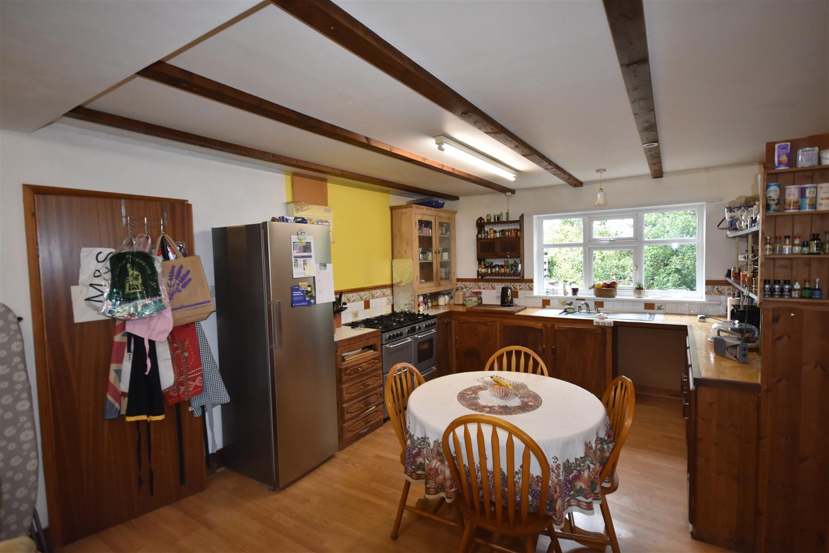 Kitchen - 7.26m x 5.79m'3.35m (23'10 x 19''11) - Fireplace and wood burning stove, Belling LPG range cooker, under stairs cupboard and back staircase off. Stainless steel sink unit and drainer, several under-worktop cupboards and corner cupboard, beamed ceiling.