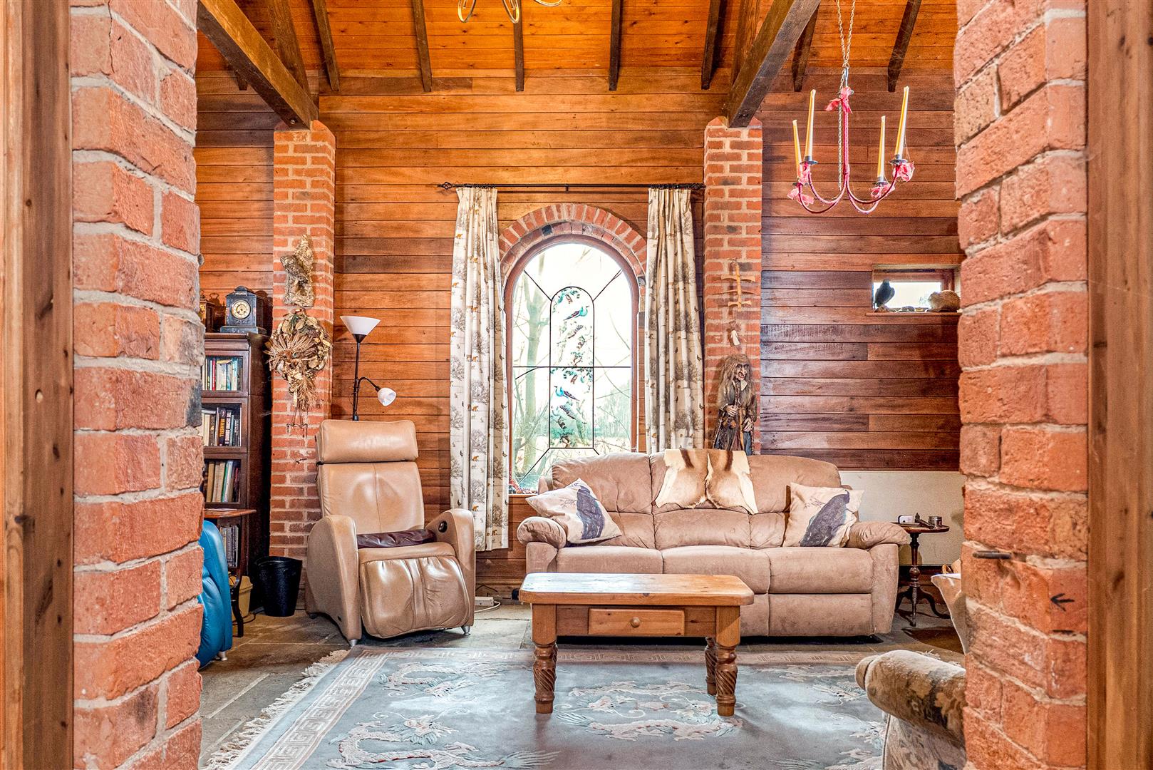 Lounge - 7.92m x 4.65m (26' x 15'3) - Vaulted ceiling with exposed King post truss sections. Inglenook fireplace with multifuel stove. There are arched window openings with pillars. Stone floor, mahogany wall panelling, and 3 panelled radiators.