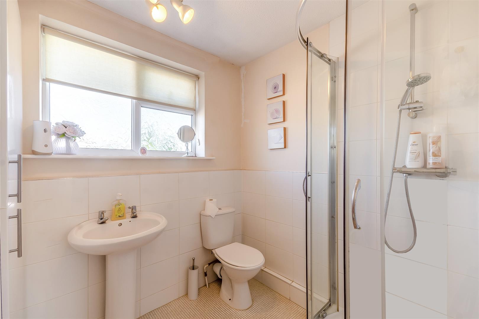 En Suite - 2.21m x 1.93m (7'3" x 6'4") - Having a three piece white suite comprising a tiled shower cubicle. Pedestal wash hand basin. Low flush WC. Part tiled walls, chrome heated towel rail, cupboard housing the combi boiler and obscure double glazed window to the front elevation.