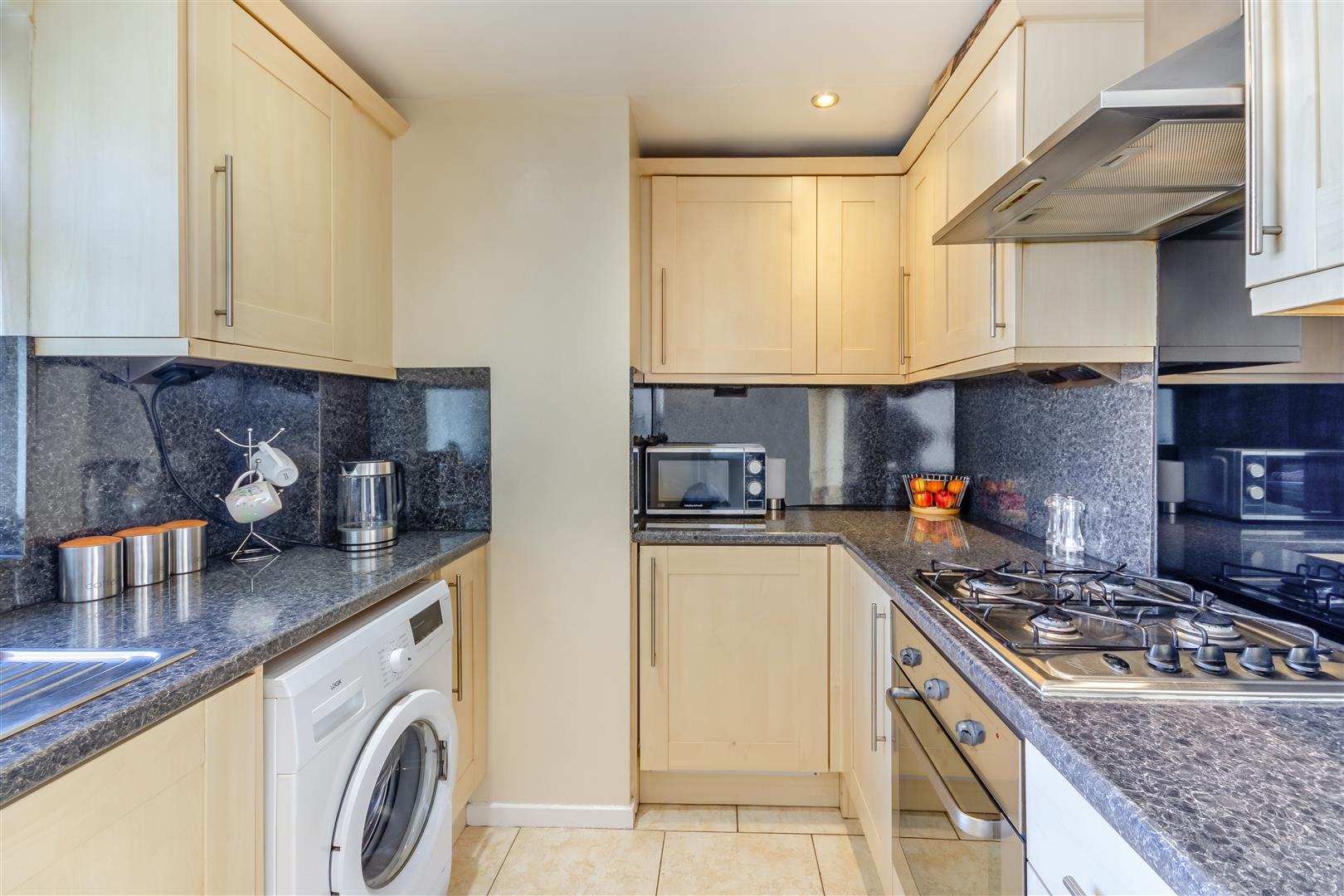 Kitchen - 3.05m x 2.29m (10'0" x 7'6") - Having wall cupboards, base units and drawers with laminate work surfaces above. Inset 1 1/2 bowl stainless steel sink with drainer and mixer tap. Integrated stainless steel appliances include an electric oven, four ring gas hob and extractor hood above. Integrated fridge and dishwasher. Plumbing for a washing machine. Tiled floor, six ceiling spotlights, double glazed window to the front elevation and obscure glazed side entrance door.