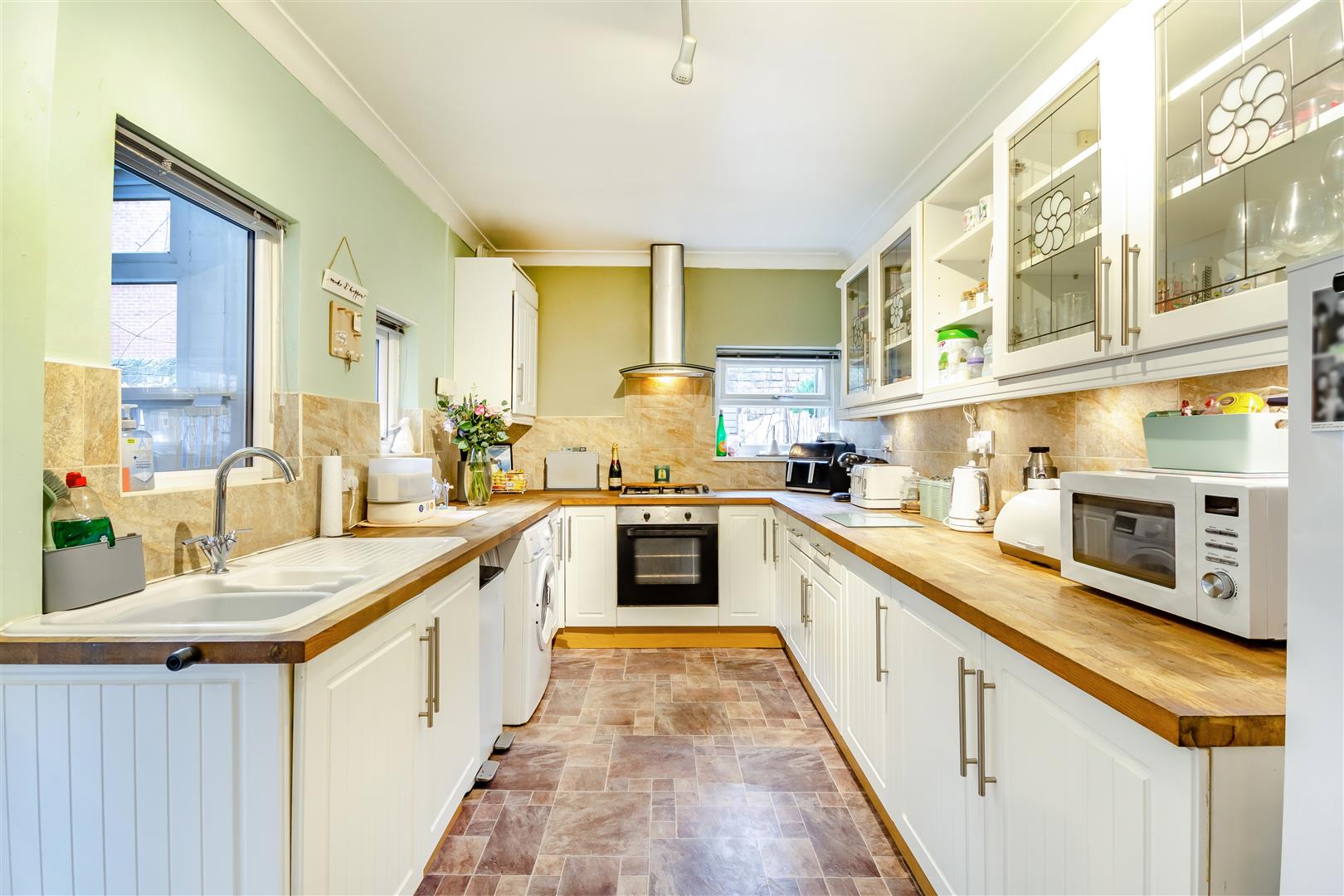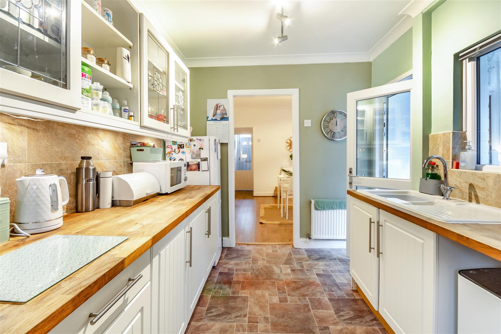 Kitchen - 4.09m x 2.46m (13'5" x 8'1") - Having wall cupboards, base units and drawers complemented by butchers block work surfaces and tiled splashbacks. Inset 1 ? bowl sink with drainer and chrome swan-neck mixer tap. Integrated single electric oven, four ring gas hob and stainless steel extractor hood above. Plumbing and space for a washing machine. Cupboard housing the gas central heating boiler and space for a fridge/freezer. Radiator, coving to ceiling, two double glazed windows to the side elevation, double glazed window to the rear elevation and door leading to: