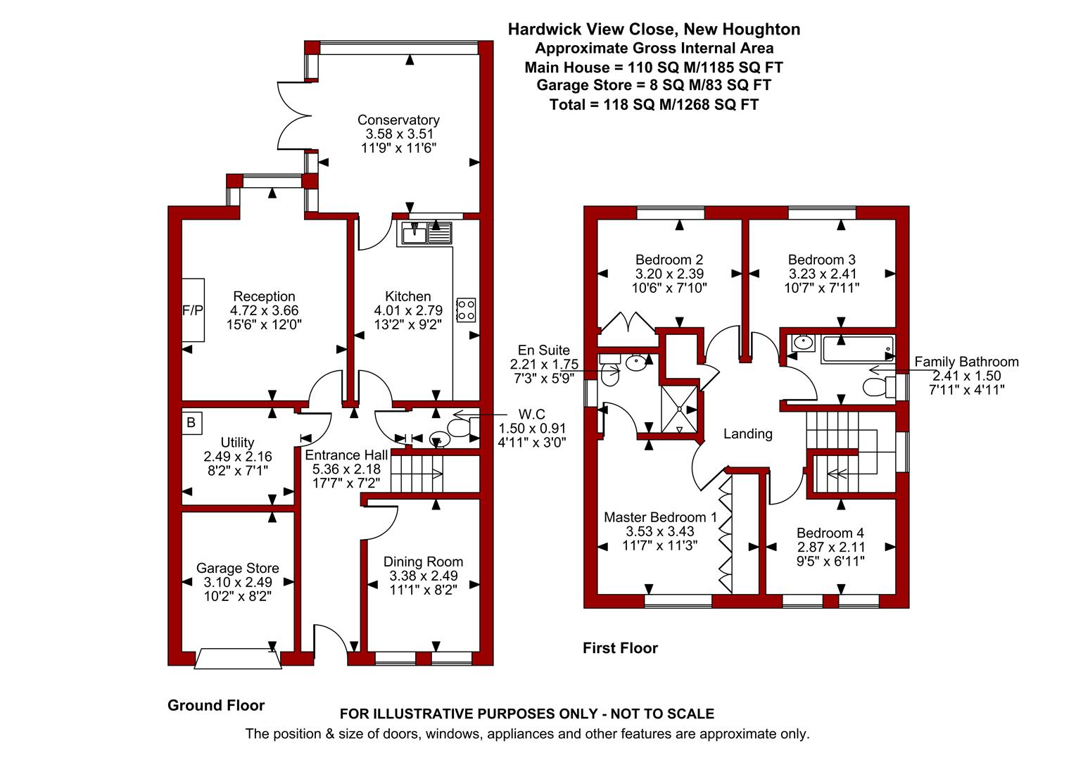 The property offers a spacious layout of living accommodation arranged over two floors with UPVC double glazing and gas central heating (Baxi Platinum combi boiler). On the ground floor there is an entrance hall, downstairs WC, utility, dining room, lounge, kitchen with a range of integrated appliances and a conservatory. The first floor landing leads to a master bedroom with extensive fitted wardrobes and a modern en suite, refitted in 2025. There are three further bedrooms and a family bathroom.