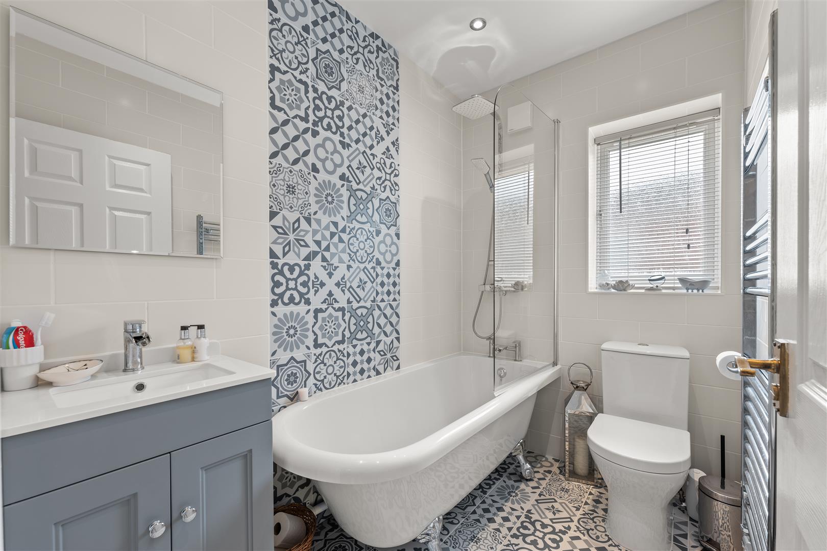 Family Bathroom - 2.41m x 1.50m (7'11" x 4'11") - Having a contemporary three piece white suite with chrome fittings comprising a roll top bathtub with claw feet and rainfall shower over plus additional shower attachment. Vanity unit with inset wash hand basin with mixer tap and storage cupboard beneath. Low flush WC. Chrome heated towel rail, radiator, tiled floor, tiled walls and obscure double glazed window to the side elevation.