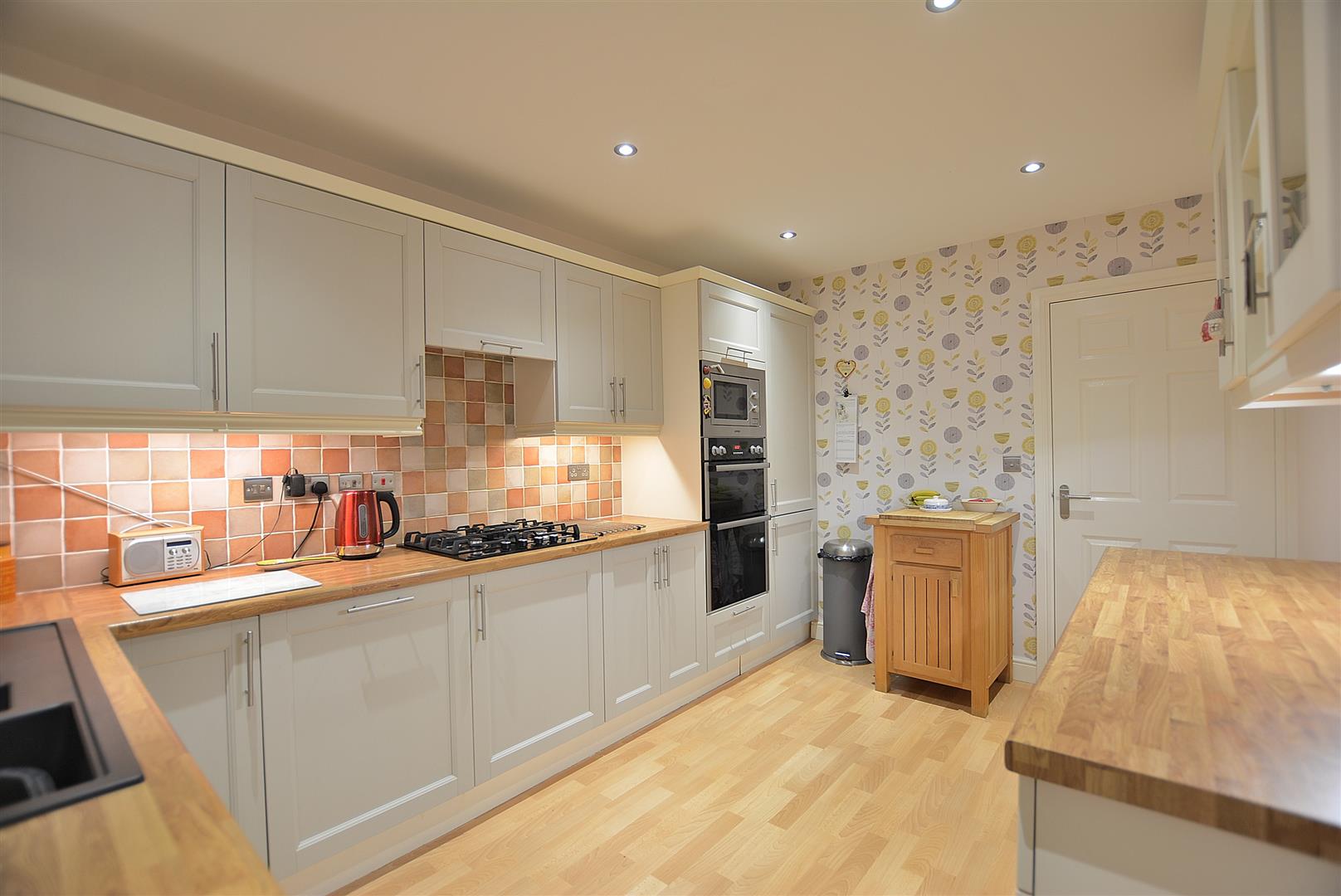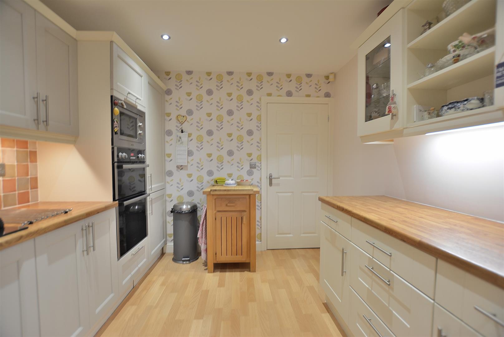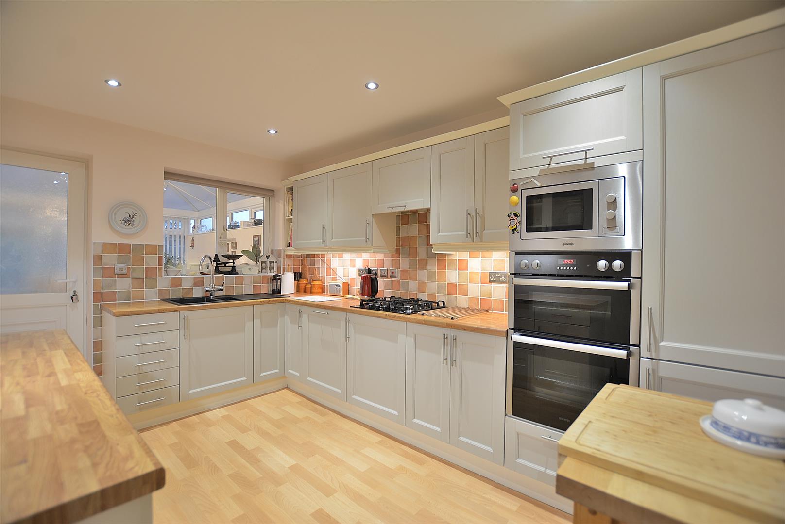 Kitchen - 4.01m x 2.79m (13'2" x 9'2") - Having a range of modern shaker style cabinets comprising wall cupboards, including display cabinets and open display shelving, base units and drawers with wood style work surfaces over. Inset 1 ? bowl sink with drainer and chrome swan neck mixer/filter tap. There are a range of integrated appliances to include an electric double oven, separate microwave oven, four ring gas hob and a concealed extractor hood above. Integrated dishwasher and integrated fridge/freezer installed in 2025. Vinyl flooring, vertical radiator, six ceiling spotlights, double glazed window and door to the rear elevation leading to:
