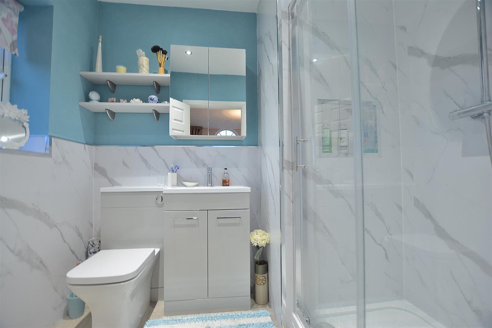 En Suite - 2.21m max x 1.75m (7'3" max x 5'9") - Having a modern three piece white suite installed in 2025 with chrome fittings comprising a double shower cubicle. Vanity unit with inset wash hand basin with mixer tap and storage cupboard beneath. Low flush WC with enclosed cistern. Vinyl flooring, chrome heated towel rail, three ceiling spotlights, extractor fan and obscure double glazed window to the side elevation.