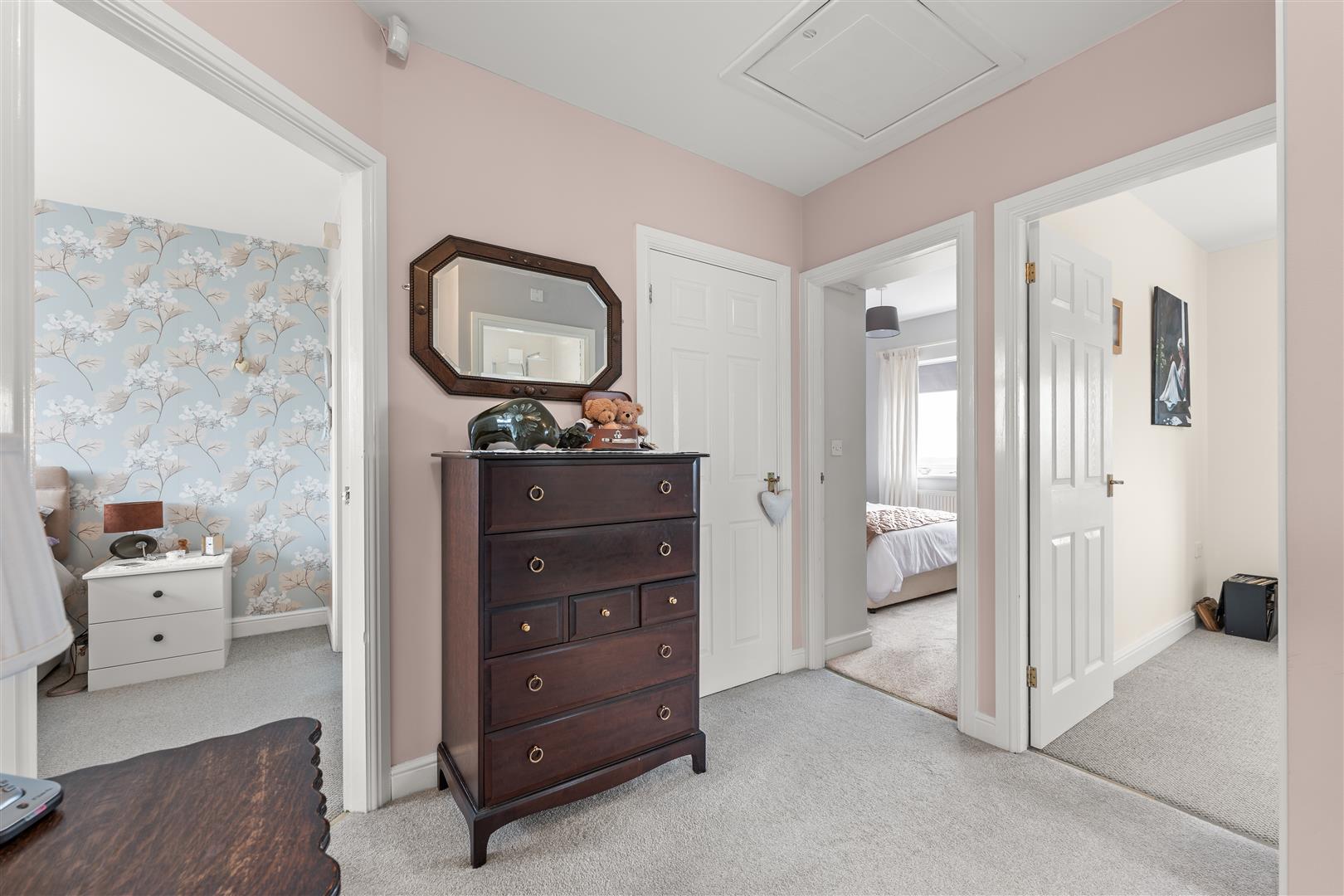 First Floor Landing - With loft access hatch having a pull down ladder giving access to a part boarded loft space with lighting. Built-in storage cupboard and double glazed window to the side elevation.