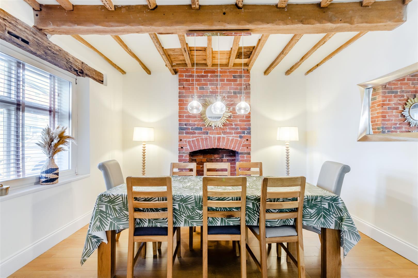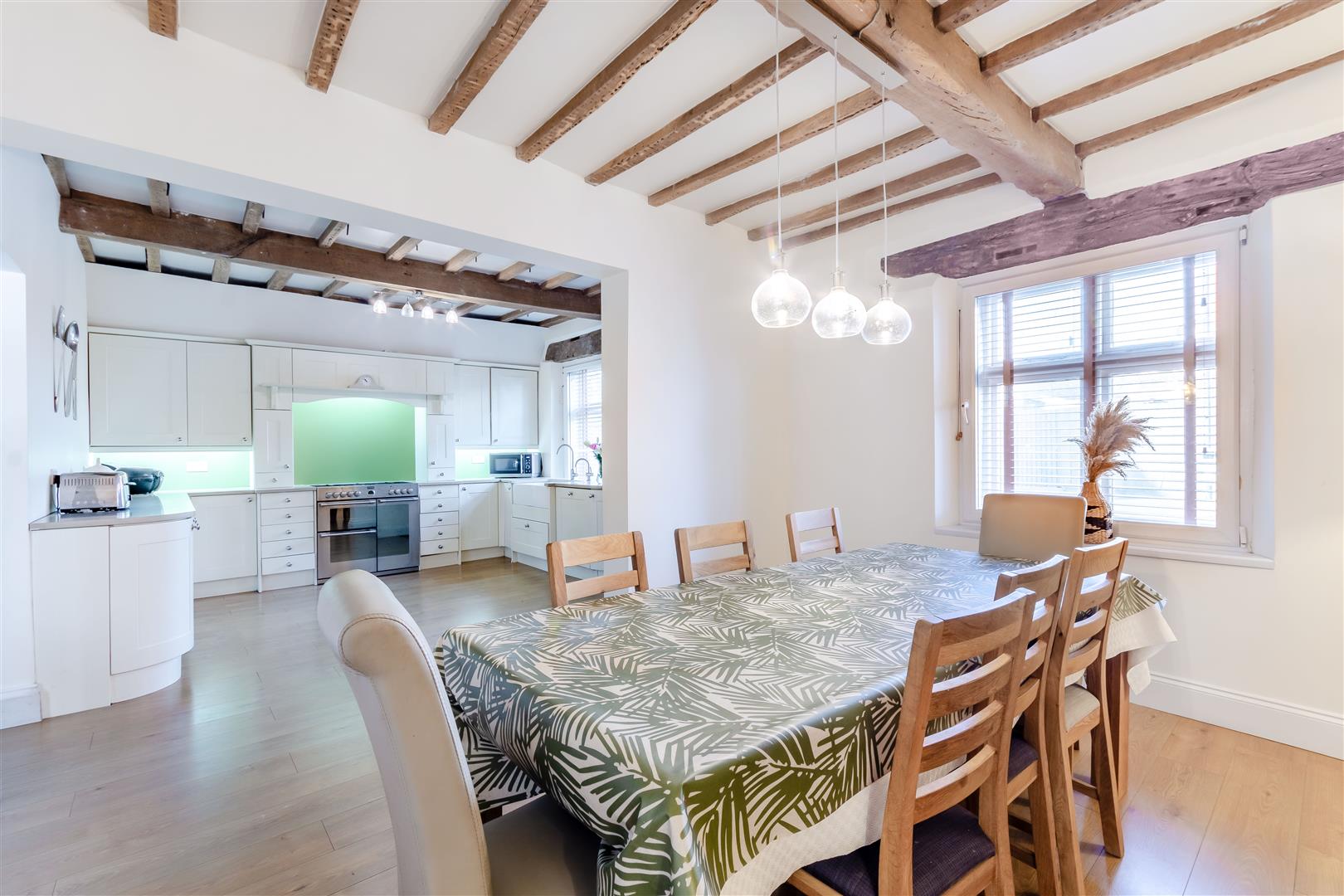 Open Plan Kitchen/Diner - 7.77m" x 3.96m (25'6" x 13'0") - A large, open plan kitchen/diner, having a range of contemporary shaker cabinets with chrome doorknobs comprising wall cupboards with under lighting, base units and drawers complemented by quartz effect work surfaces. Inset twin Belfast sinks with brushed chrome mixer tap plus separate filtered water tap. There is space for a freestanding range cooker with built-in extractor hood above. Integrated dishwasher. Heavily beamed ceiling, laminate floor, underfloor heating, brick fireplace to the dining area and two windows to the front elevation with UPVC secondary double glazing.