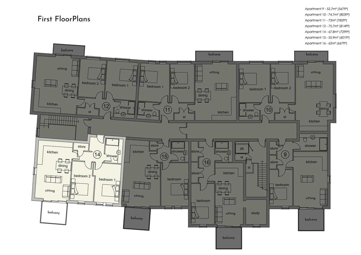 Apartment 14: 729 sq ft. A first floor apartment occupying a corner position, comprising an entrance hall, airing cupboard, open plan living/dining/kitchen with access to a front west facing balcony, two double bedrooms and a shower room.