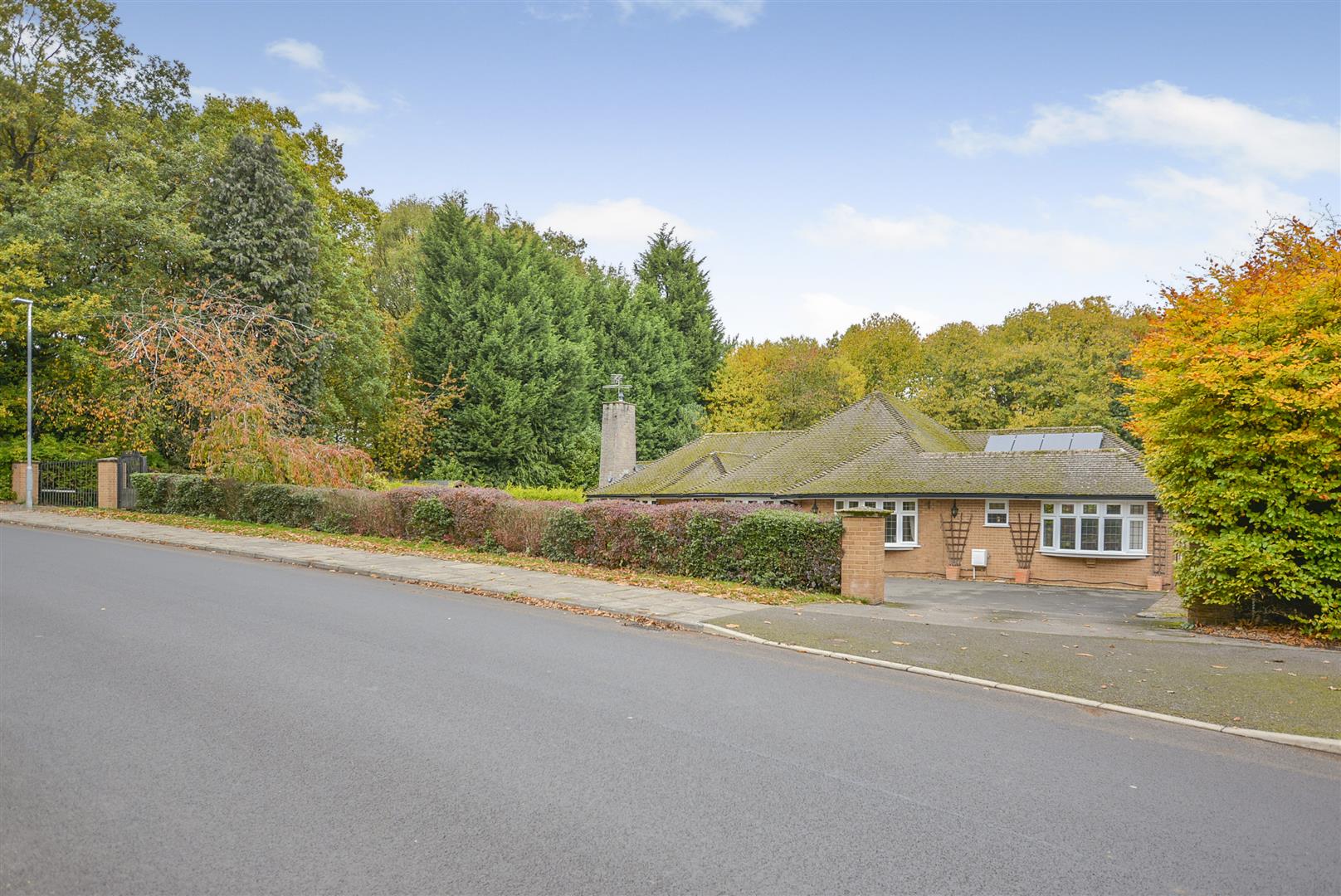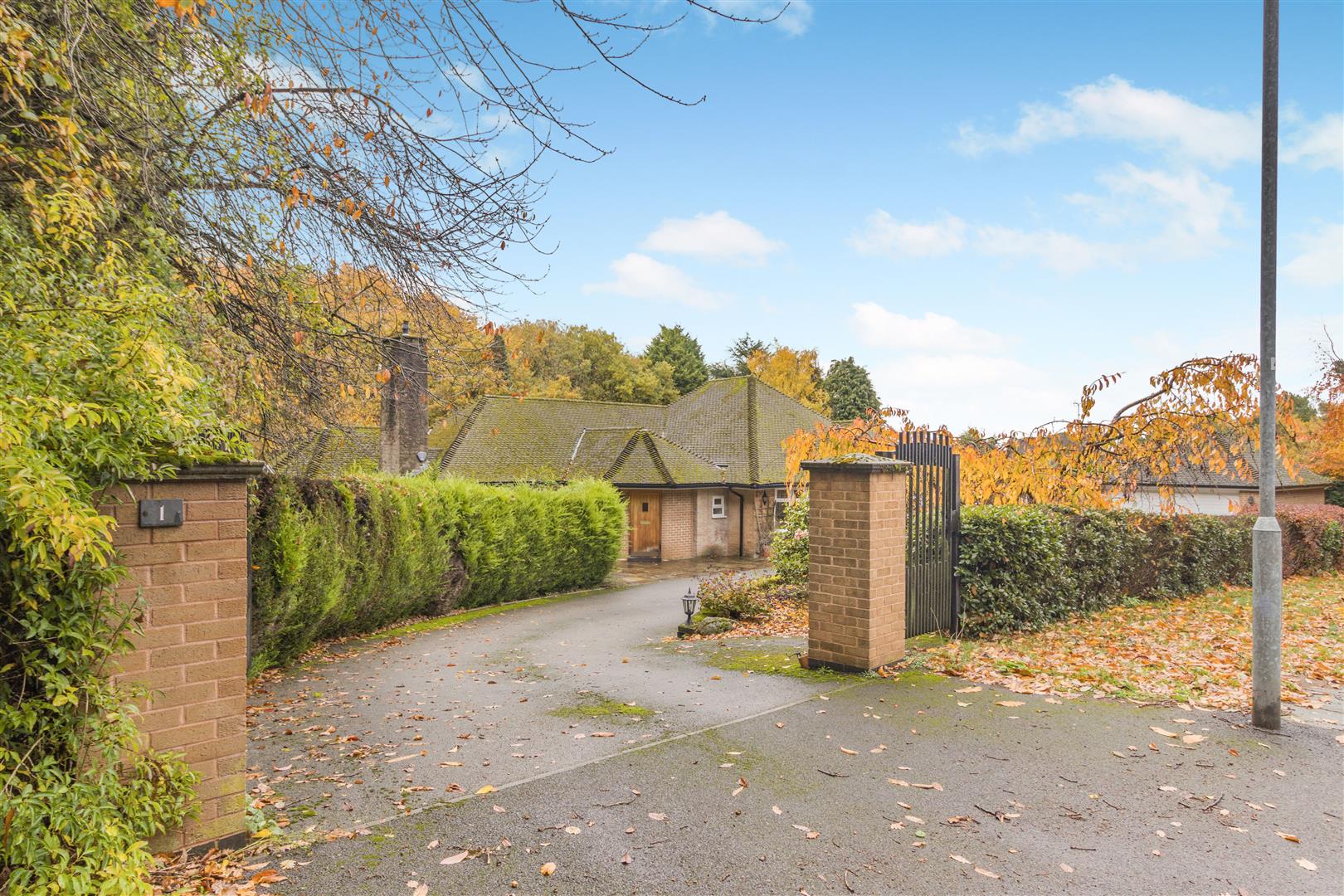 Outside - The property is positioned on North Park, an exclusive location in one of south Mansfield's most highly regarded addresses with a most delightful woodland backdrop bordering to Berry Hill Park. The property stands back from the road behind a hedgerow boundary frontage with double brick pillars at each end with one having a pedestrian gate and gated entrance opening to a substantial in-and-out tarmacadam driveway with turning space and off road parking for numerous vehicles. There is a low retaining stone wall boundary with a raised garden area above topped with driveway lighting. There is a large detached double garage with a remote controlled electric door and additional parking to the side which leads round behind the garage to a useful storage area with gate providing access to the side and rear of the property. There is a high walled boundary between the property and garage with a pedestrian gate opening to a large, south facing, private paved patio side garden area with further gate leading to a low maintenance gravel area with space to keep a shed or greenhouse. Beyond here, takes you to the rear garden which is completely private with extensive lawns, conifers and mature plants, shrubs and trees. There is an extensive patio which extends across the full width of the property with central seating area and a winding pathway leading to further seating area at the end of the garden. The garden enjoys wonderful privacy and a lovely backdrop of trees bordering to Berry Hill Park. To the other side of the property, there is a substantial, private patio on two levels with a low stone wall boundary with raised beds above and a high walled boundary and gate provides access to the front.