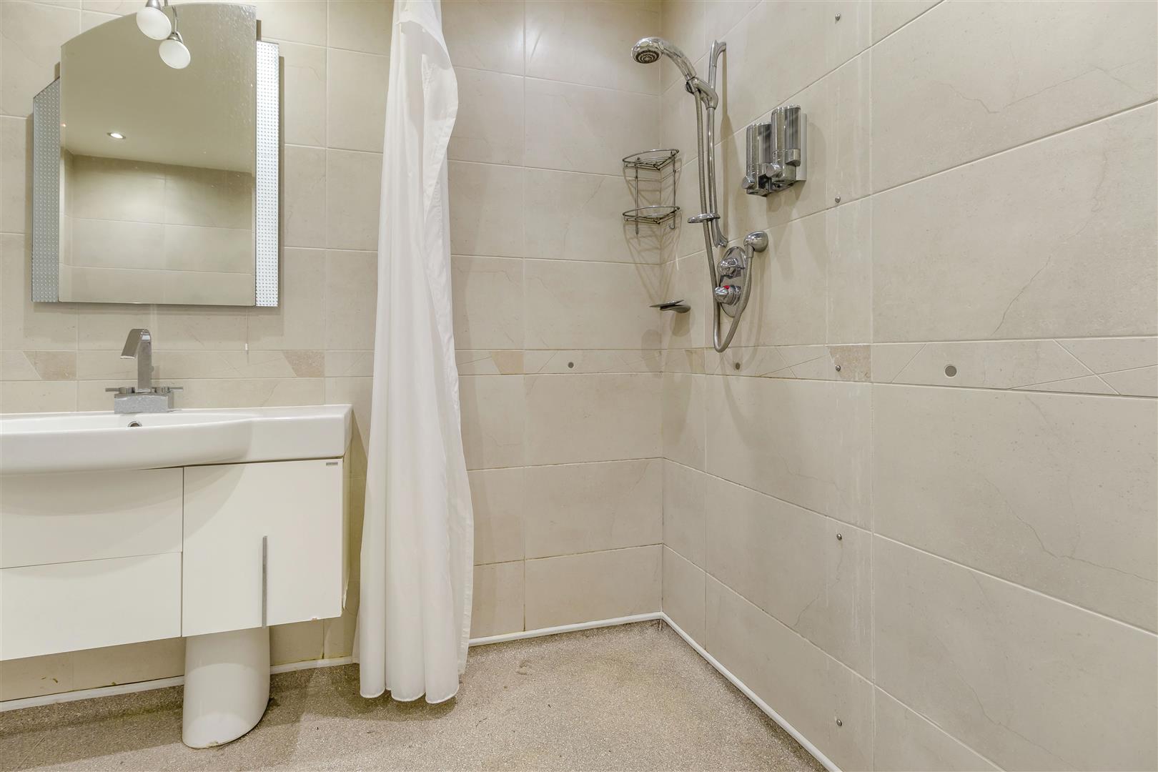 Bathroom/Wet Room - 2.97m x 2.67m (9'9" x 8'9") - Having a modern three piece white suite with chrome fittings comprising a bathtub with swan-neck mixer tap. Wall hung vanity unit with inset wash hand basin with swan-neck mixer tap and storage cupboards beneath. Low flush WC. Walk-in shower area with wall mounted shower. Nine ceiling spotlights, chrome heated towel rail, extractor fan and wall mounted cupboard.