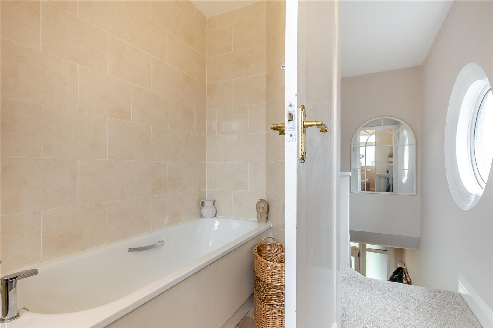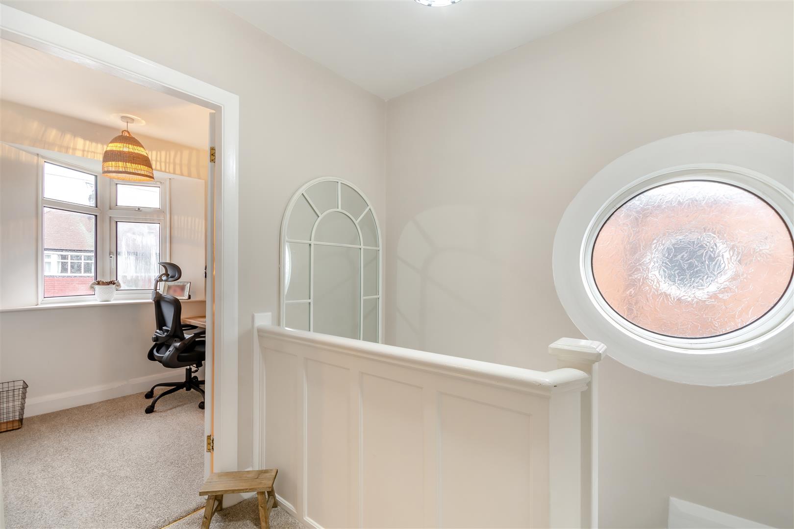 First Floor Landing - 2.74m max x 2.03m (9'0" max x 6'8") - Having a feature circular obscure double glazed window to the side elevation.
