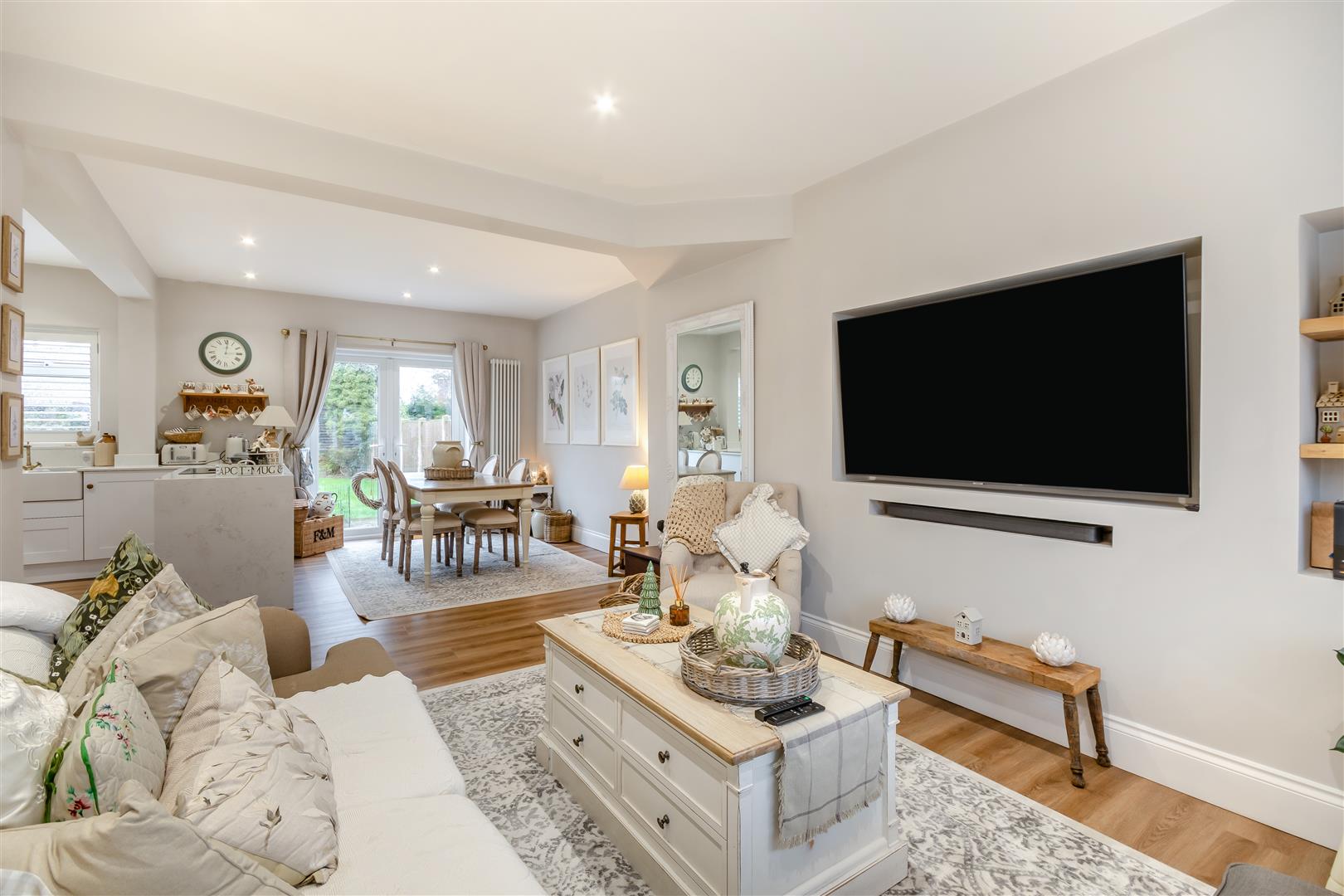 Open Plan Living/Dining/Kitchen - 8.08m into bay x 5.84m (26'6" into bay x 19'2") - A wonderfully refurbished, L-shaped, open plan family living space with defined kitchen, dining and living areas offering a fantastic living space featuring a built-in media wall with space for a television and sound bar below, plus built-in display shelving. The kitchen features a range of contemporary shaker cabinets comprising wall cupboards, base units and drawers complemented by quartz work surfaces with matching upstands and waterfall feature at the end of the peninsula island. There is an under mounted twin Belfast sink with swan-neck brass mixer tap. Integrated appliances include a single electric oven, four ring induction hob with down draught extractor, fridge/freezer and dishwasher. There is laminate flooring throughout, radiator, floor-to-ceiling radiator, ample ceiling spotlights, double glazed bay window to the front elevation, double glazed window to the rear elevation and French doors leading out onto the rear garden.