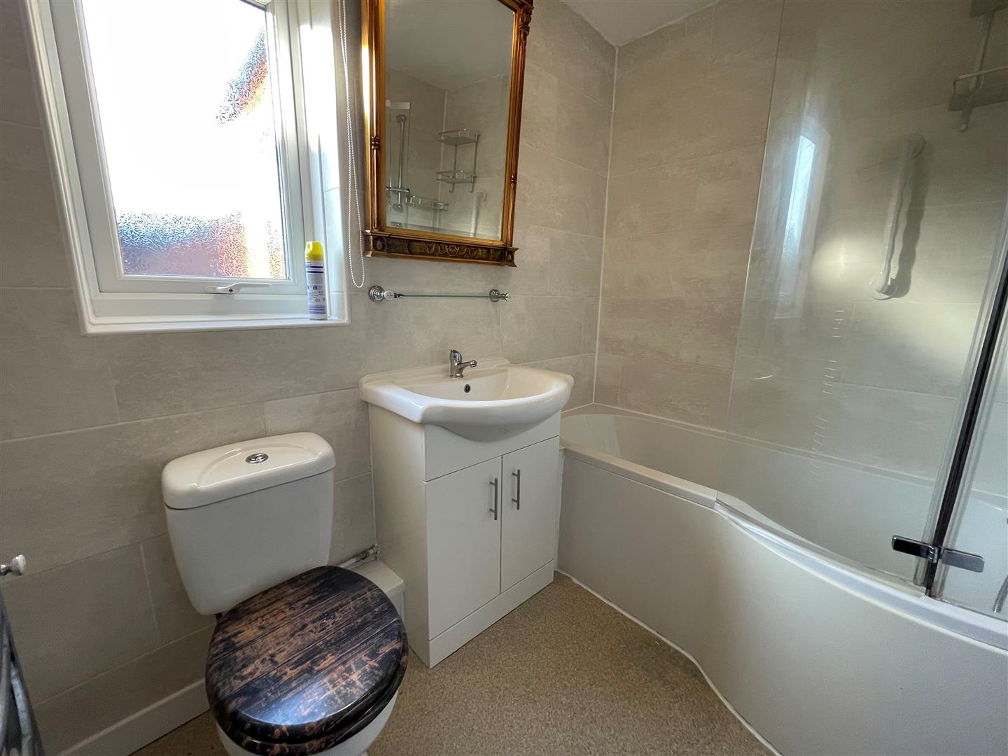 Bathroom - White suite comprising combined shower/bath with screen and chrome shower fitting. Basin with cabinets, low suite WC, tiled walls and chrome heated towel rail.