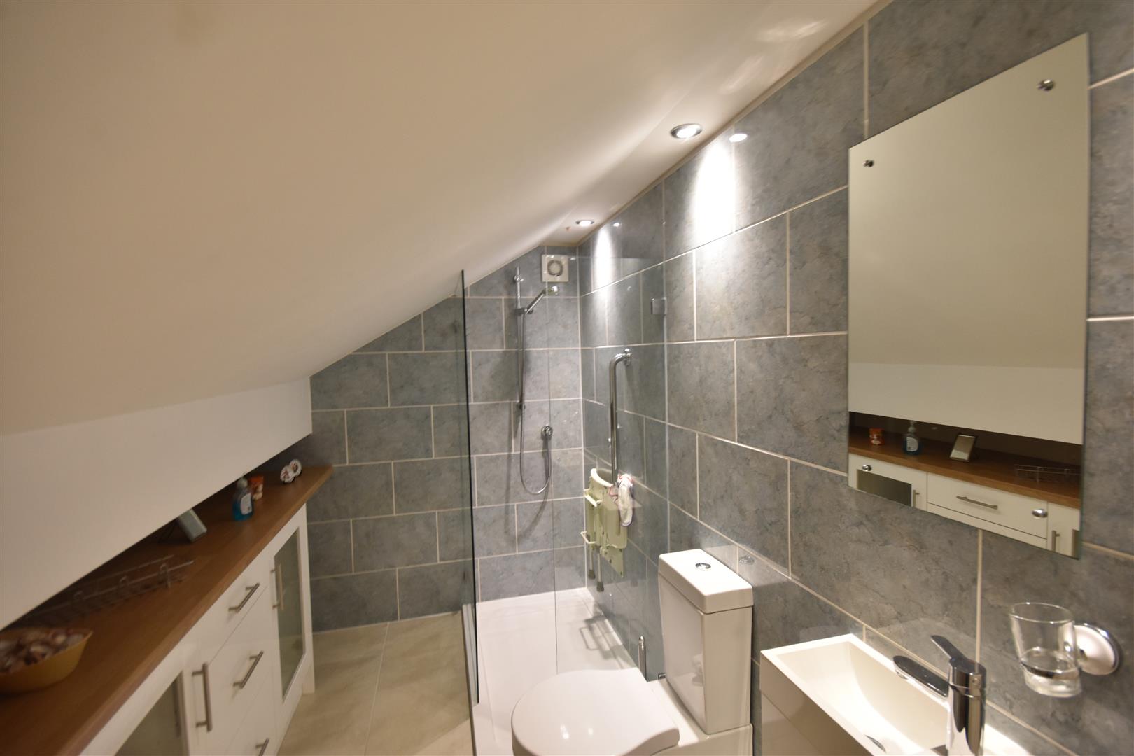 En-Suite - 3.43m x 2.16m (11'3 x 7'1) - Shower with glass screen and chrome fittings, basin, low suite WC. Fitted cupboard, chrome heated towel rail and low door to storage space in the roof eaves.