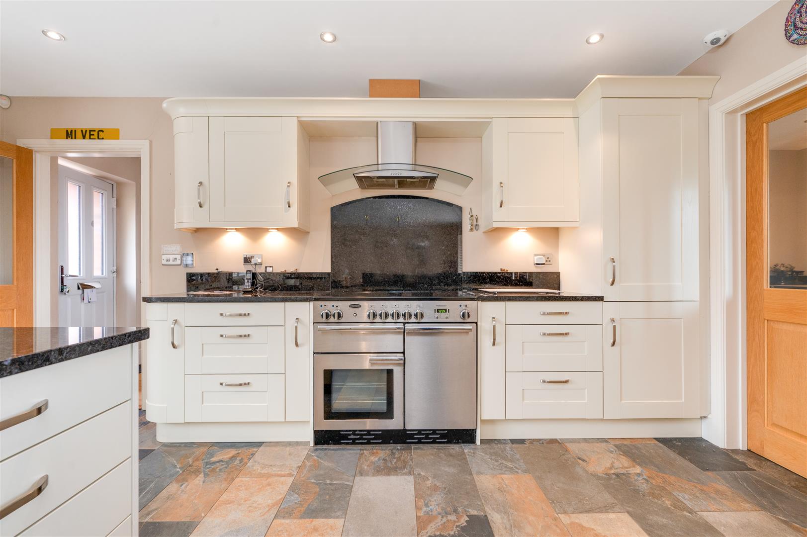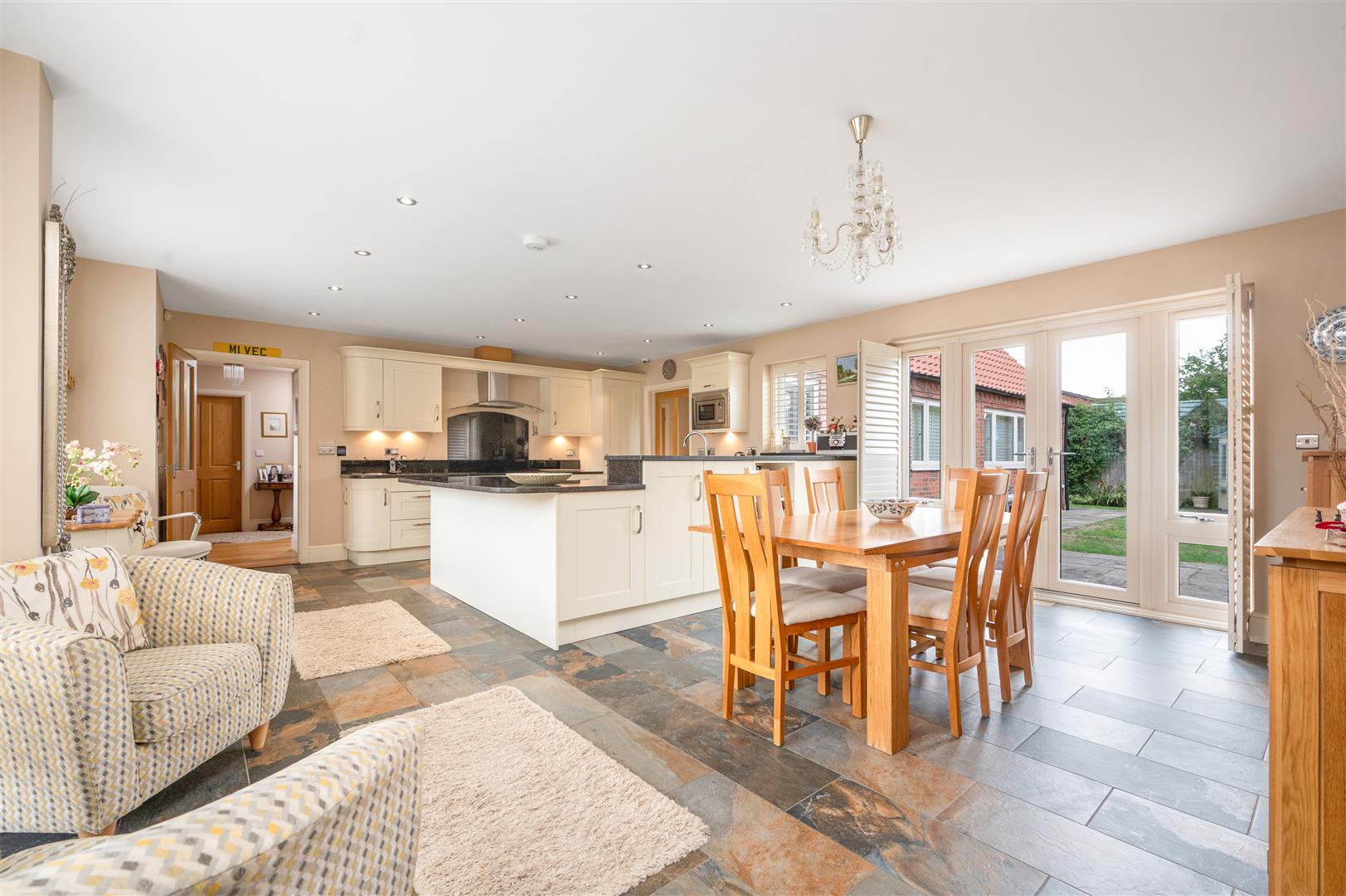 Open Plan Kitchen/Diner - 7.26m x 5.44m (23'10 x 17'10) - A range of wall cupboards, base units with granite working surfaces incorporating a stainless steel sink unit. Rangemaster electric cooker with hood, integrated microwave and dishwasher. LED lighting, centre opening French doors in the east elevation. Integrated fridge freezer. Space for a dining table and comfortable seating. French doors giving access to the rear garden.