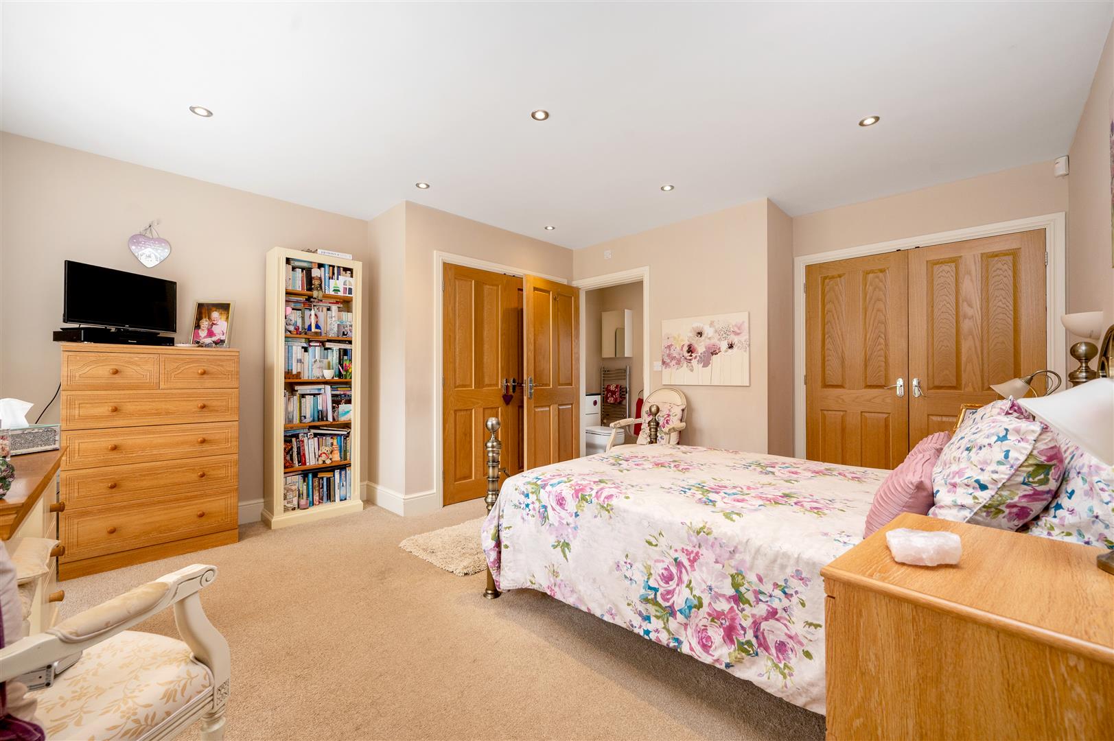 En-Suite - With 3'10 wide shower, basin with cabinets and low suite WC. Tiled floor, LED lighting, shaver point and chrome heated towel rail.