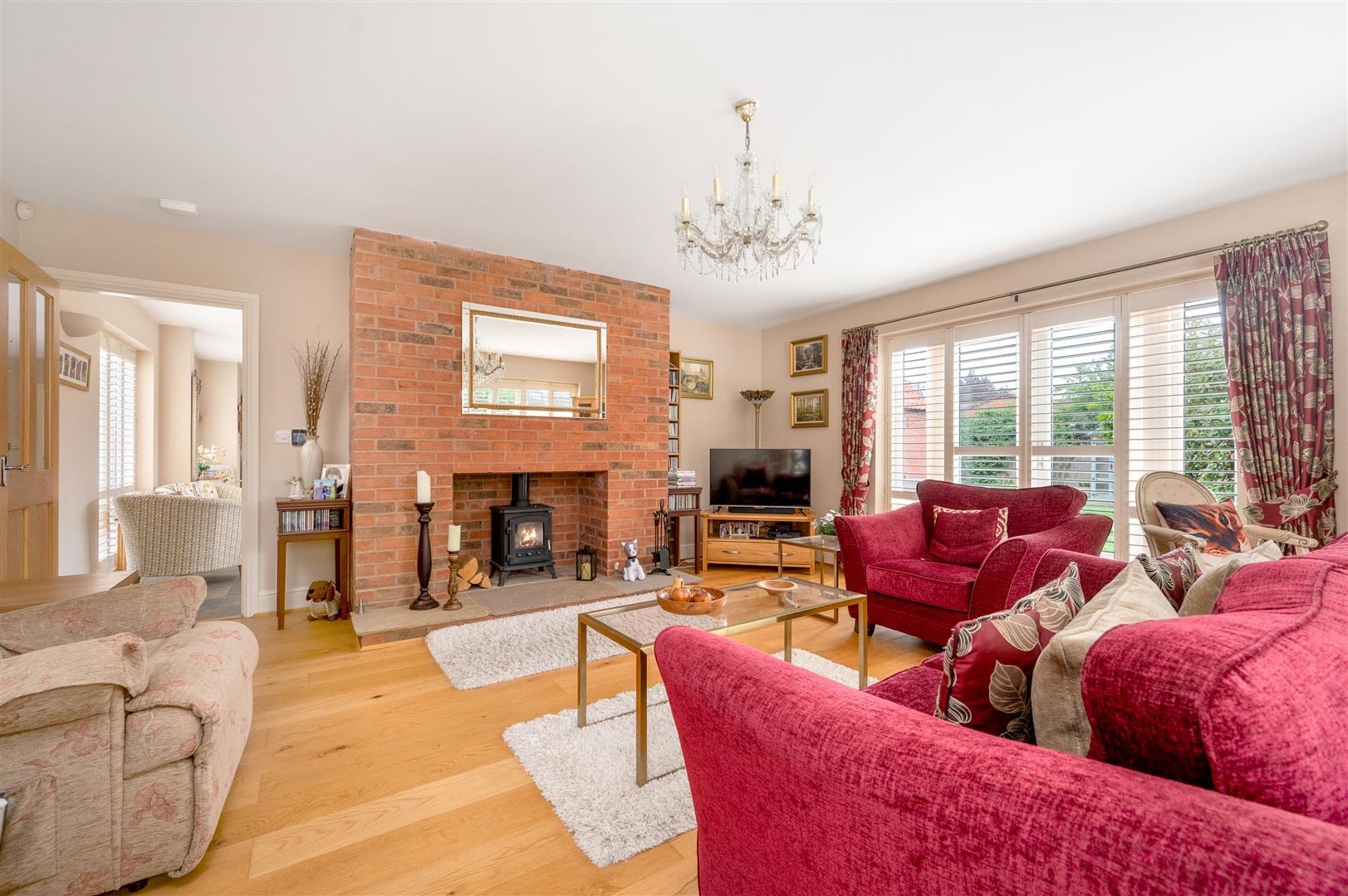 Sitting Room - 5.38m x 5.00m (17'8 x 16'5) - With deep window openings and French windows in the south and east elevations. Fitted wall lights and provision for a centre light. Brick constructed chimney breast and open fireplace with multifuel stove and stone hearth. Oak floor finish.