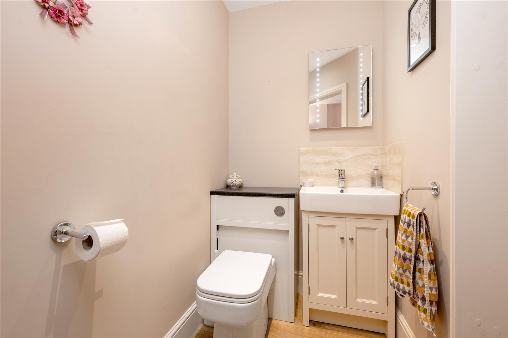 Cloakroom - With fitted cabinets, low suite WC, vanity basin, mirror fronted cabinet and LED lighting.
