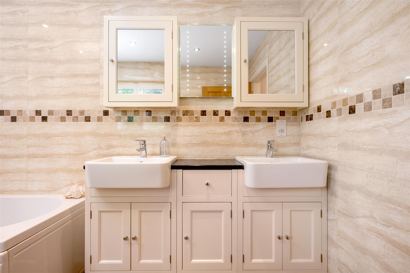 Bathroom - 3.40m x 2.11m (11'2 x 6'11) - Fully tiled walls and tiled floors, bath with screen, shower over. Twin wash basins with cabinets, low suite WC, chrome heated towel rail, LED lighting.