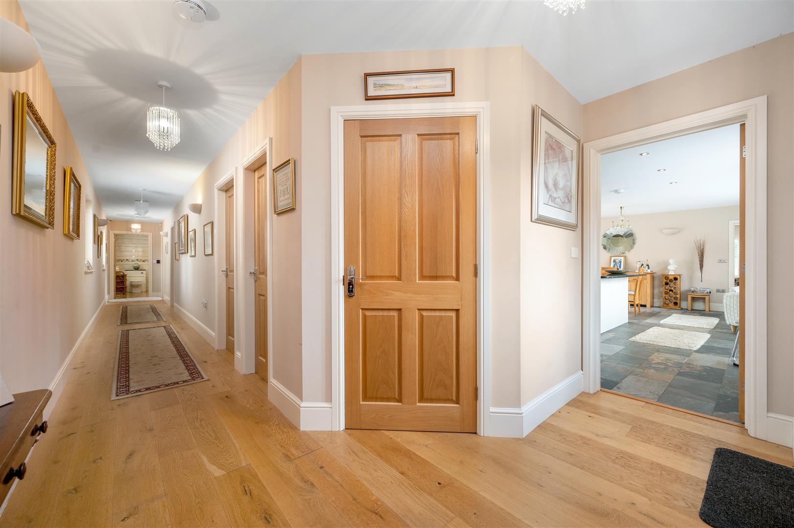 Entrance Hall - With storage cupboard, large airing cupboard, security alarm controls, oak flooring.