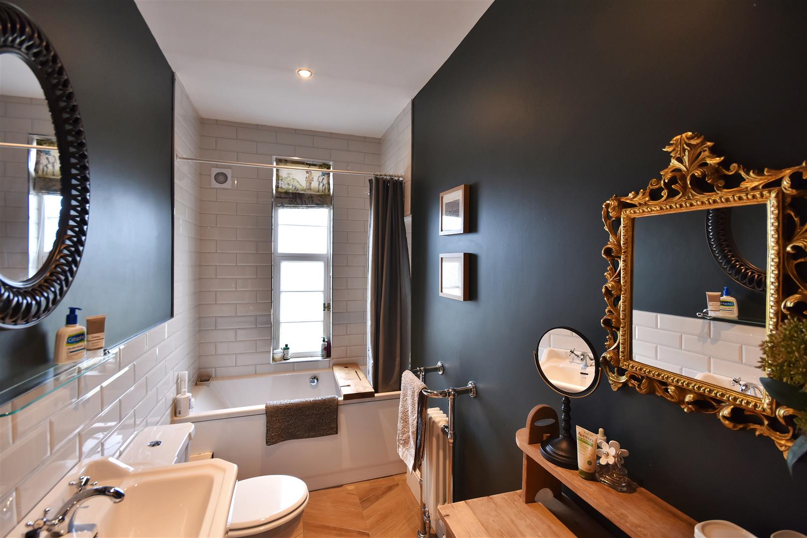 Mezzanine Bathroom - Freestanding bath, low suite wc, basin, chrome heated towel rail, tiled floor, storage recess, conservation roof light, chrome heated towel rail. LED lighting.