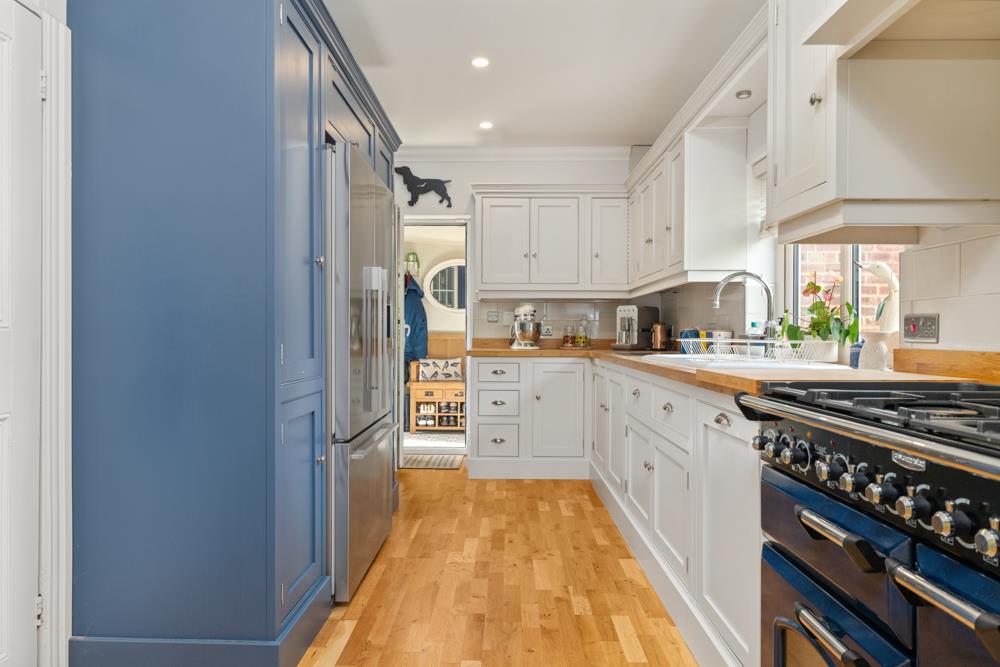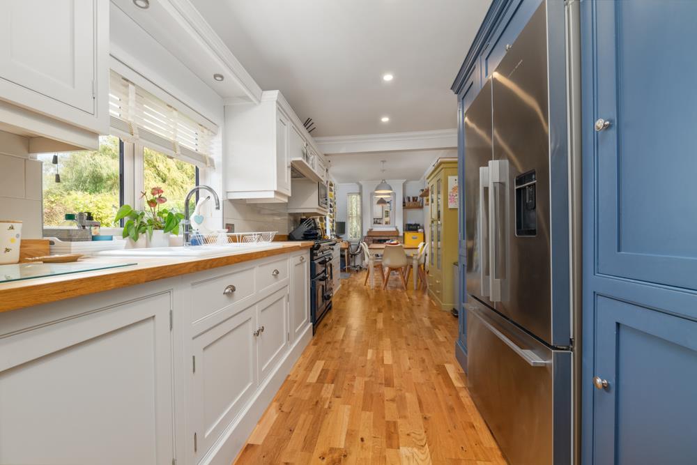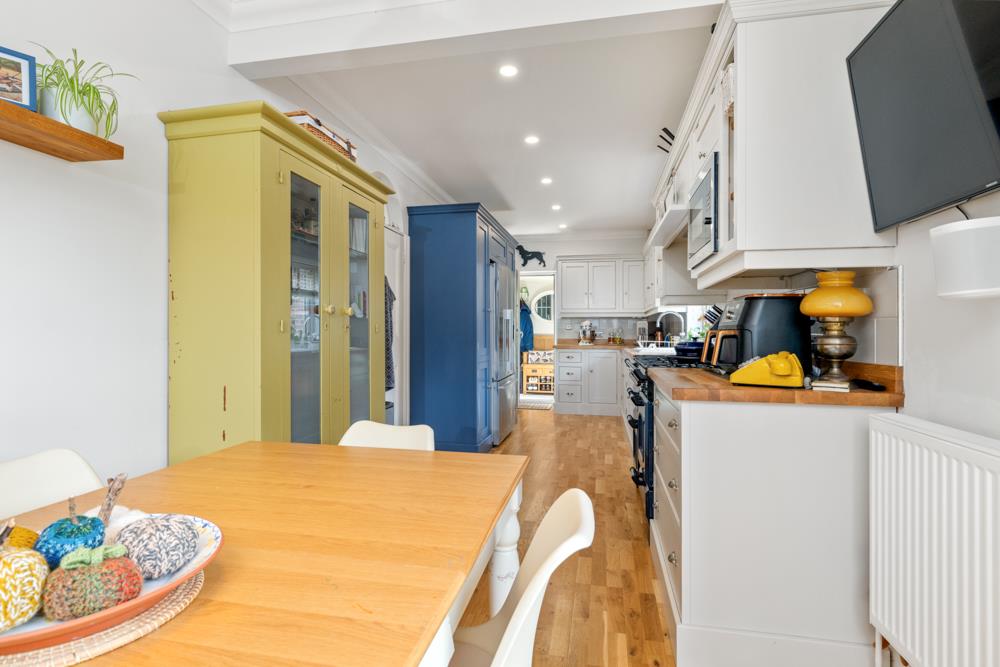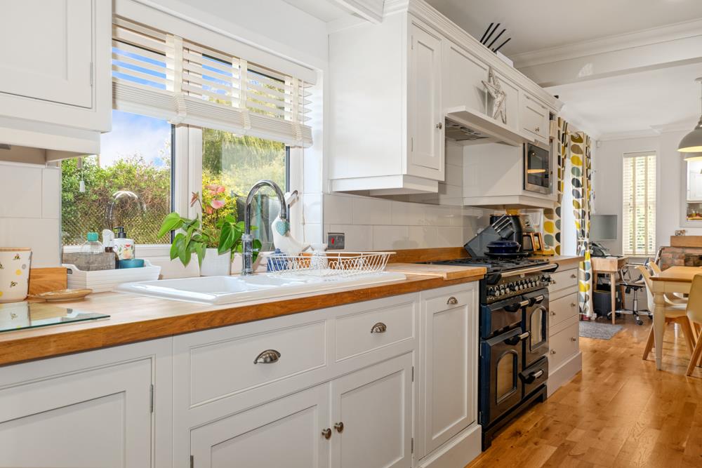 UPVC double glazed window and a set of uPVC double glazed French doors are to the rear elevation giving access to the garden. Brick built fireplace and hearth, space for a family dining table. Engineered oak flooring. The kitchen has been refitted in recent years with a range of bespoke hand made solid wood kitchen units painted with Farrow & Ball paint comprising base units with cupboards and drawers, solid wood block working surfaces over with inset ceramic one and a half bowl sink and drainer. Eye level wall mounted cupboards, built in extractor. There are two tall larder cupboards incorporating the built-around fridge space suitable for housing a fridge freezer. Integral appliances include a dishwasher. There is space for a cooking range with extractor over. Side entrance door leading to entrance porch.