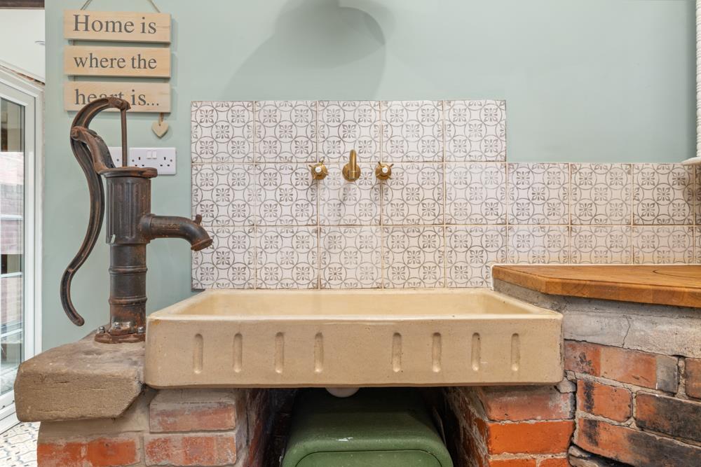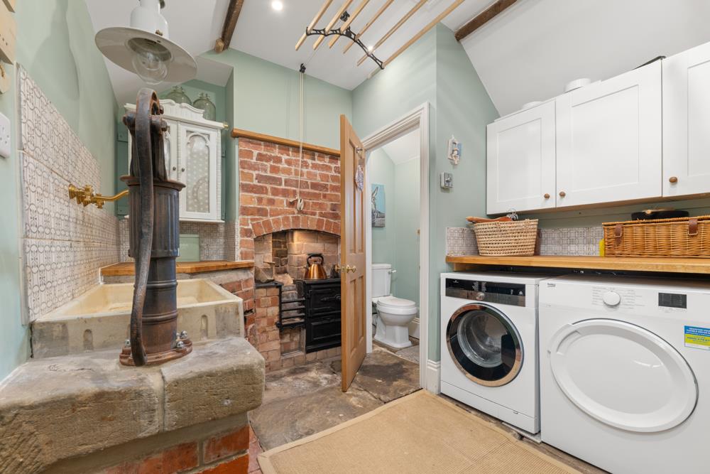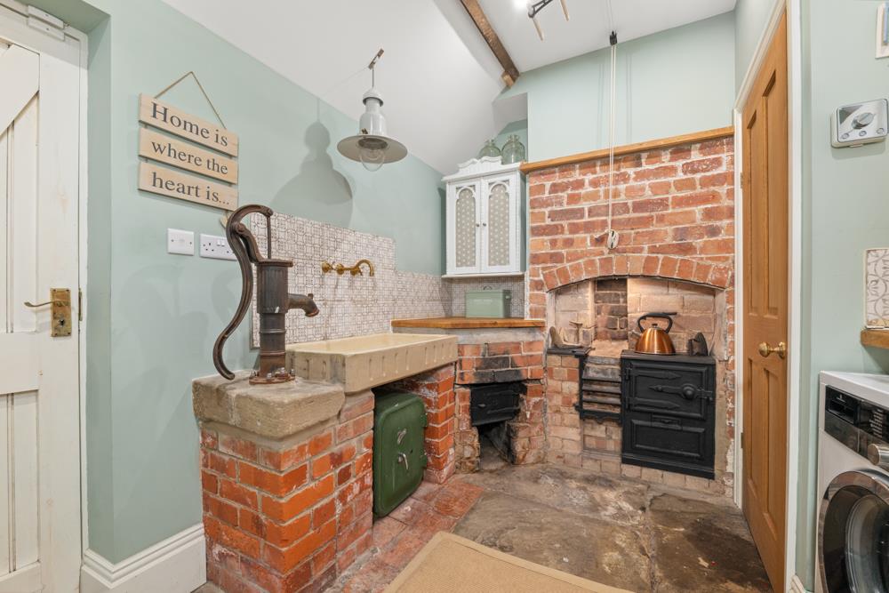 Utility Room - 2.95m x 1.91m (9'8 x 6'3) - Converted from the former wash house this room is full of character and retains original features. Vaulted and beam ceiling. Original stone floor, period trough sink mounted on brick built stands, tiling to splash backs with wall mounted brass mixer tap. Feature period hand operated water pump mounted on a stone plinth adjacent to the sink. Restored copper boiler and brick fireplace with original cast iron range. Solid wood working surfaces, plumbing and space for automatic washing machine, wall mounted storage cupboards. Volta Camray 5 oil fired central heating boiler.