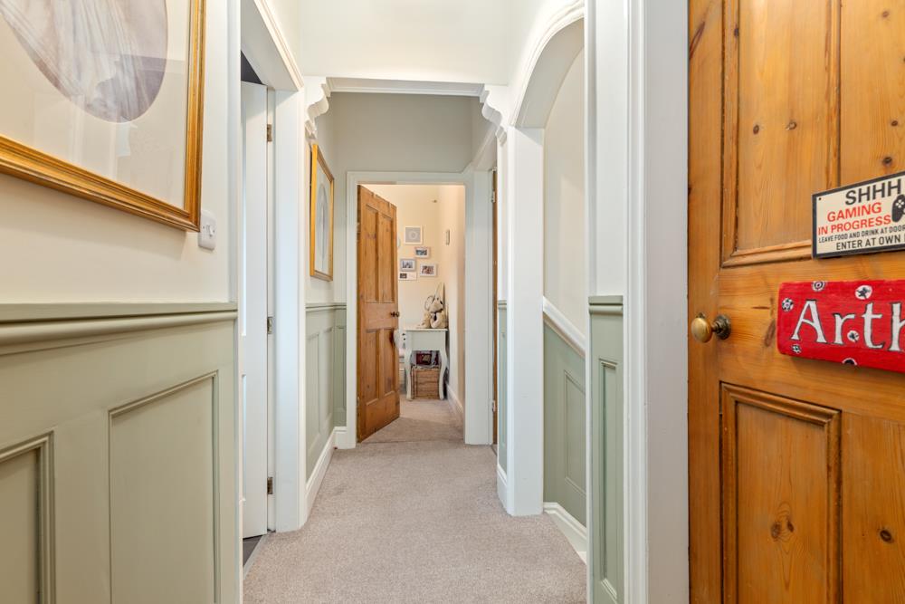 Entrance Hall - Panelled front entrance door with glazed light over, Minton style ceramic tiled floor which is insulated underneath. Staircase to first floor, panelled dado.