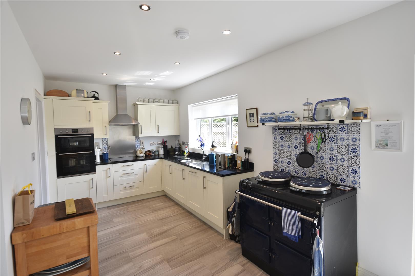The accommodation provides an entrance hall with a fine staircase leading to the galleried landing, downstairs cloakroom, lounge, separate dining room or family room. The kitchen has two sets of centre opening south facing French windows and the electric Aga was fitted only 2 years ago (not included in the sale but negotiable). The first floor provides five bedrooms, master bedroom and guest bedroom en suite, and a family bathroom. The gross internal area is 2,100 sq. ft approximately, notably with good storage and no wasted space. The double garage stands with a paved driveway and double width parking. Photos taken last summer show the beautiful garden.