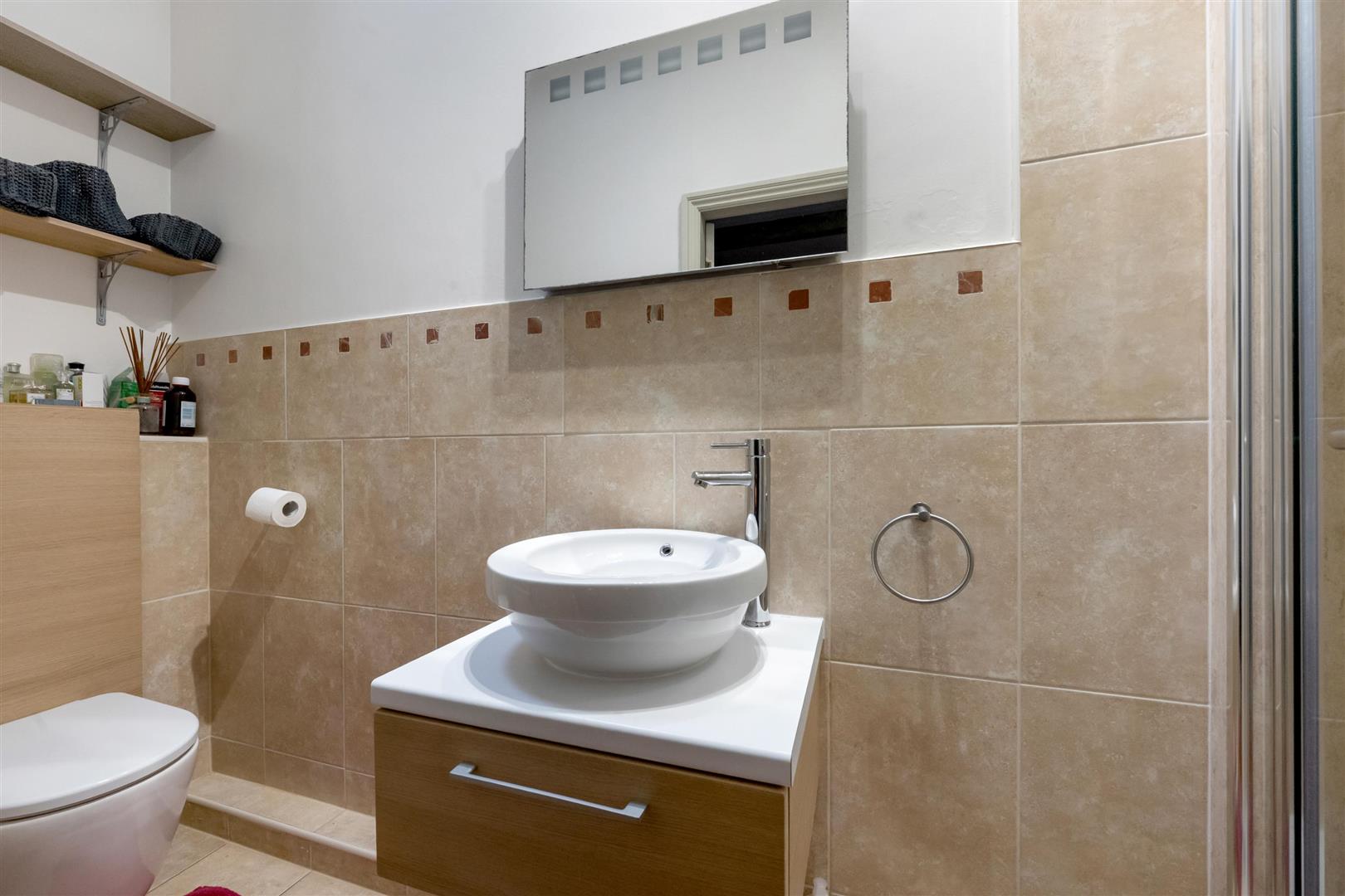 En-Suite Shower Room - 3.63m x 0.94m (11'11 x 3'1) - Extractor fan, beamed ceiling, Velux roof light. Shower cubicle with glass screen door, shower boards to wall. Overhead rain head shower and hand shower. Modern white low suite WC, wash hand basin with mixer tap, counter top with cupboard under. Heated towel radiator, part tiled walls. Wall mounted shelf.