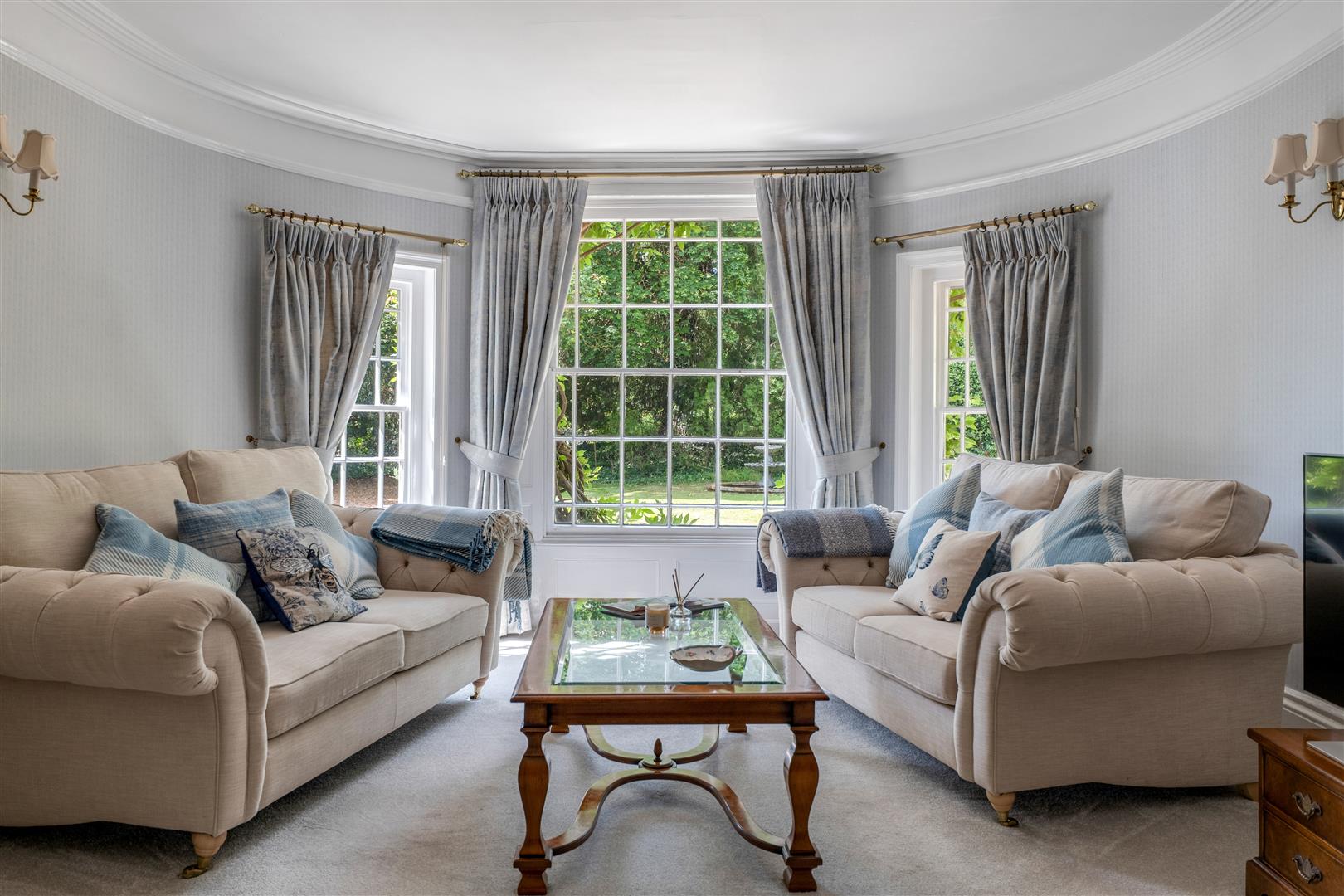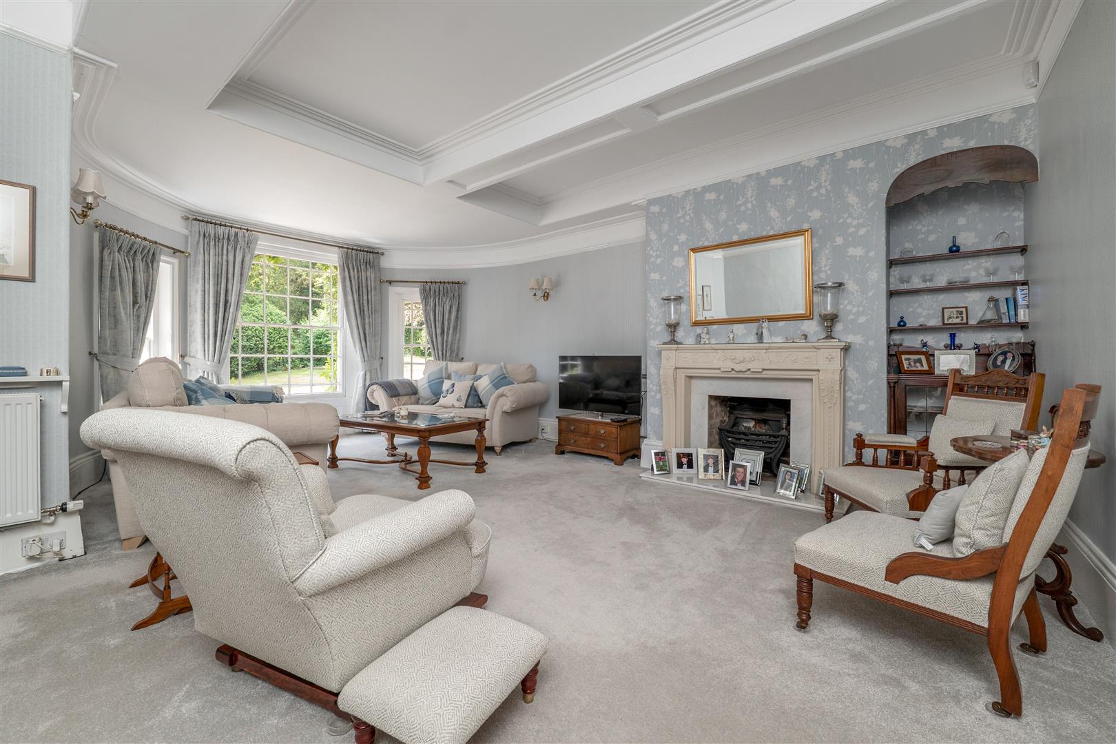 Drawing Room - 6.71m x 5.77m (22' x 18'11) - Overall measurements measured into the oval window bay, box sash windows, fireplace, picture rail, radiator, moulded ceiling cornice and panelled ceiling.