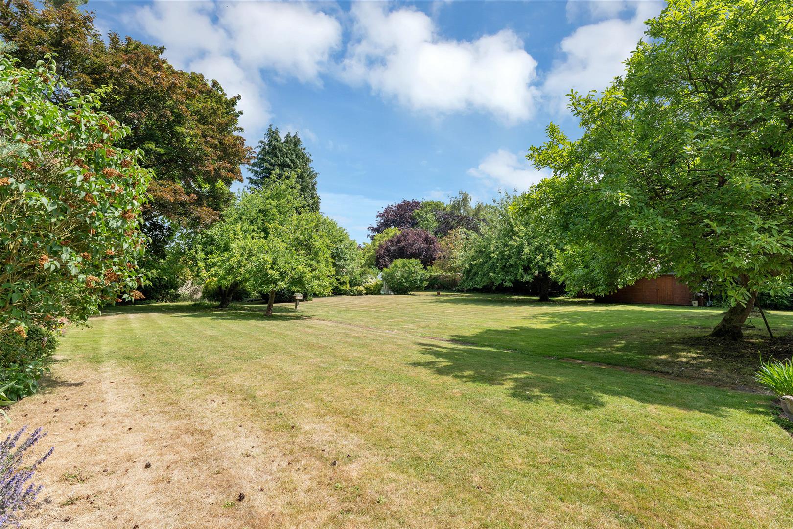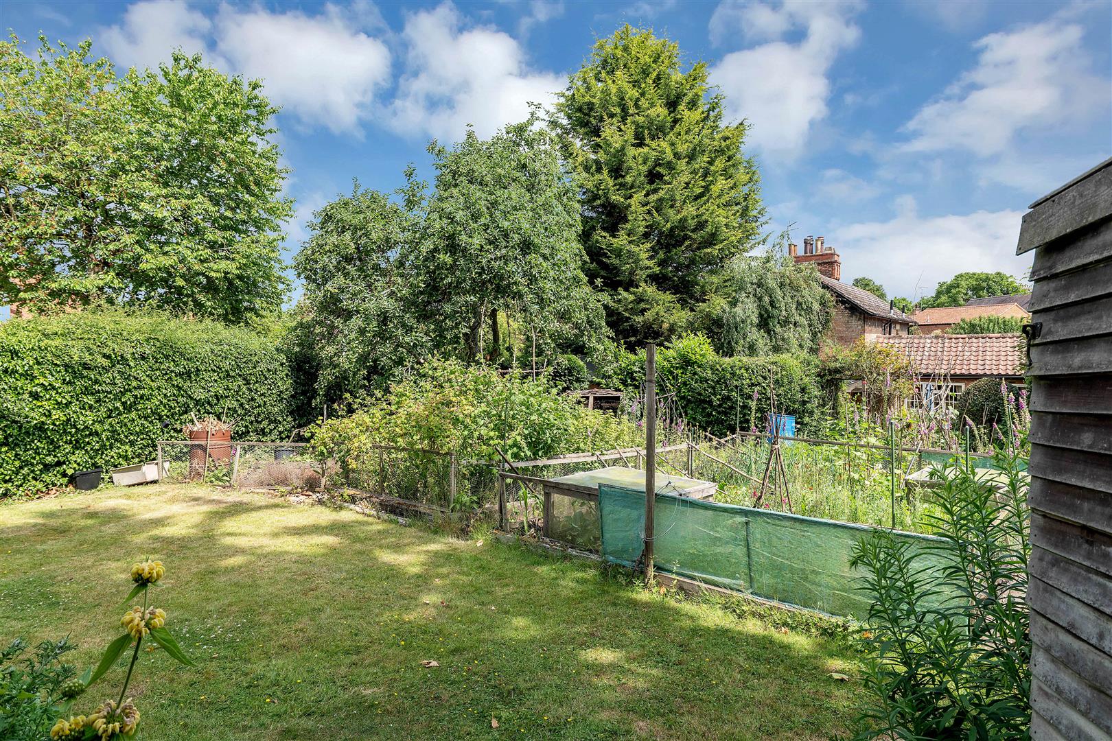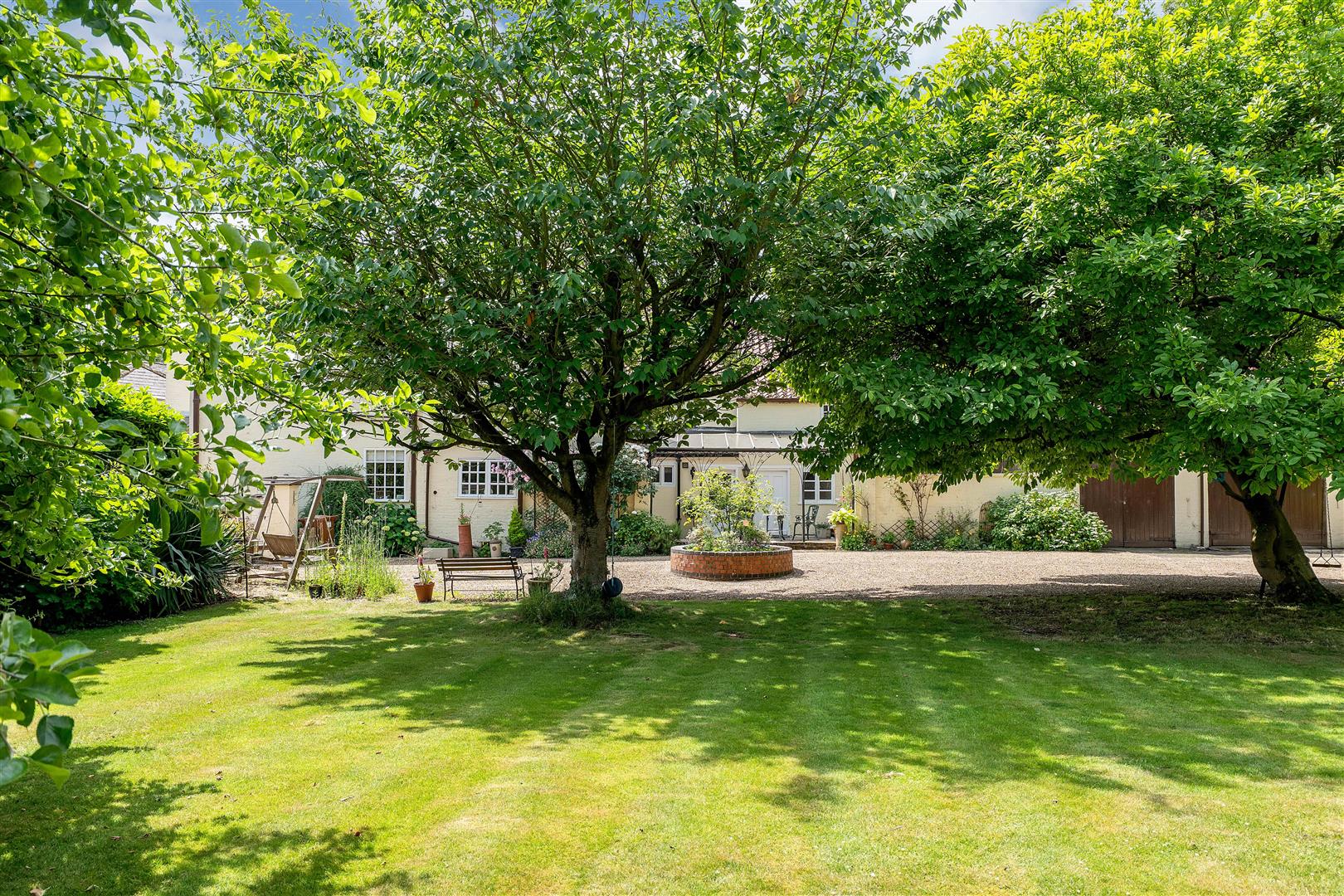 Gardens to the south side of the house contain a patio area and a former croquet lawn. Here there is a spinney with a variety of trees.