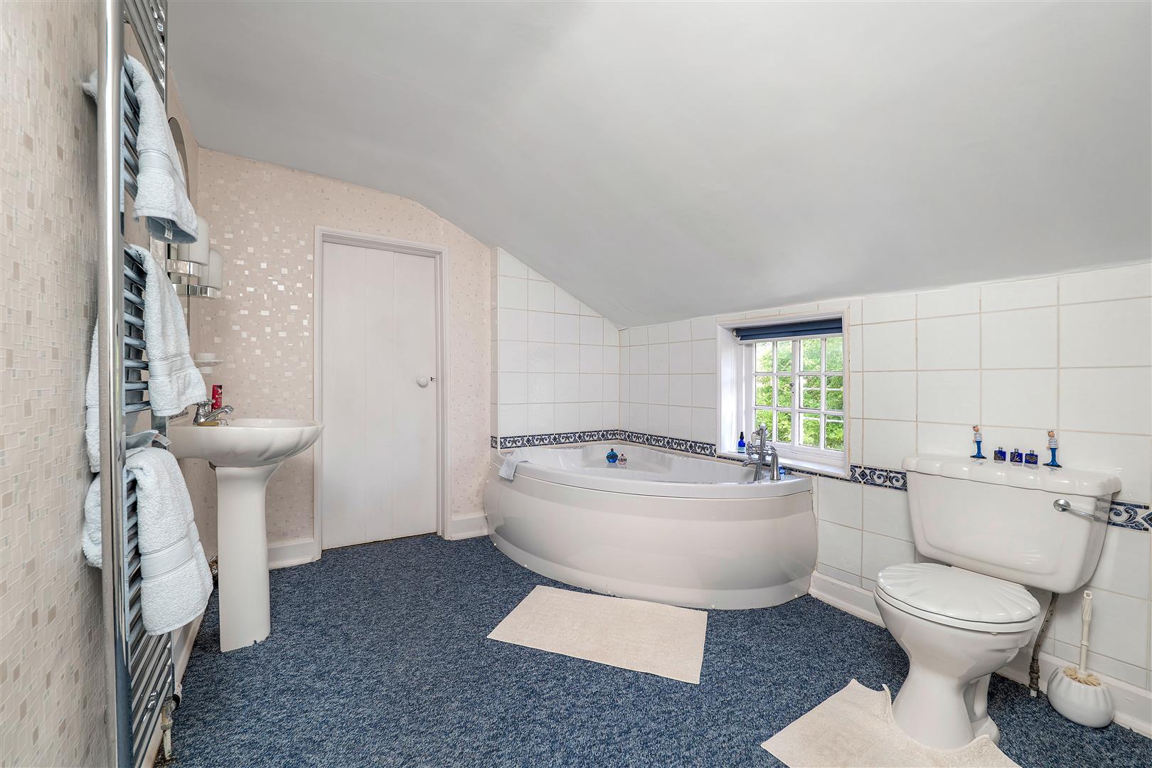 Bathroom Two - 3.86m x 2.44m (12'8 x 8') - With corner bath, low suite WC, pedestal basin, built-in cupboard, Yorkshire slider window and chrome heated towel rail.