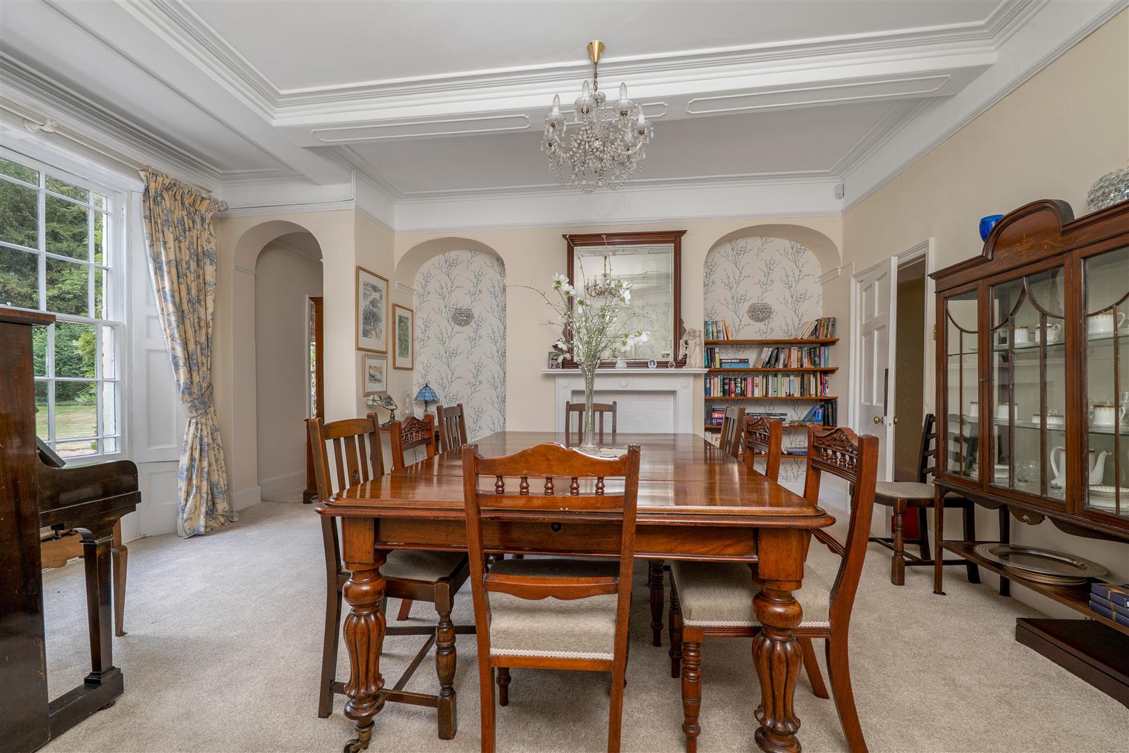 Dining Room - 5.13m x 4.98m (16'10 x 16'4) - Measured within the window recess, featuring box-sash shuttered windows and an oval, apse-style recess. Picture rail, moulded ceiling cornice and fireplace.