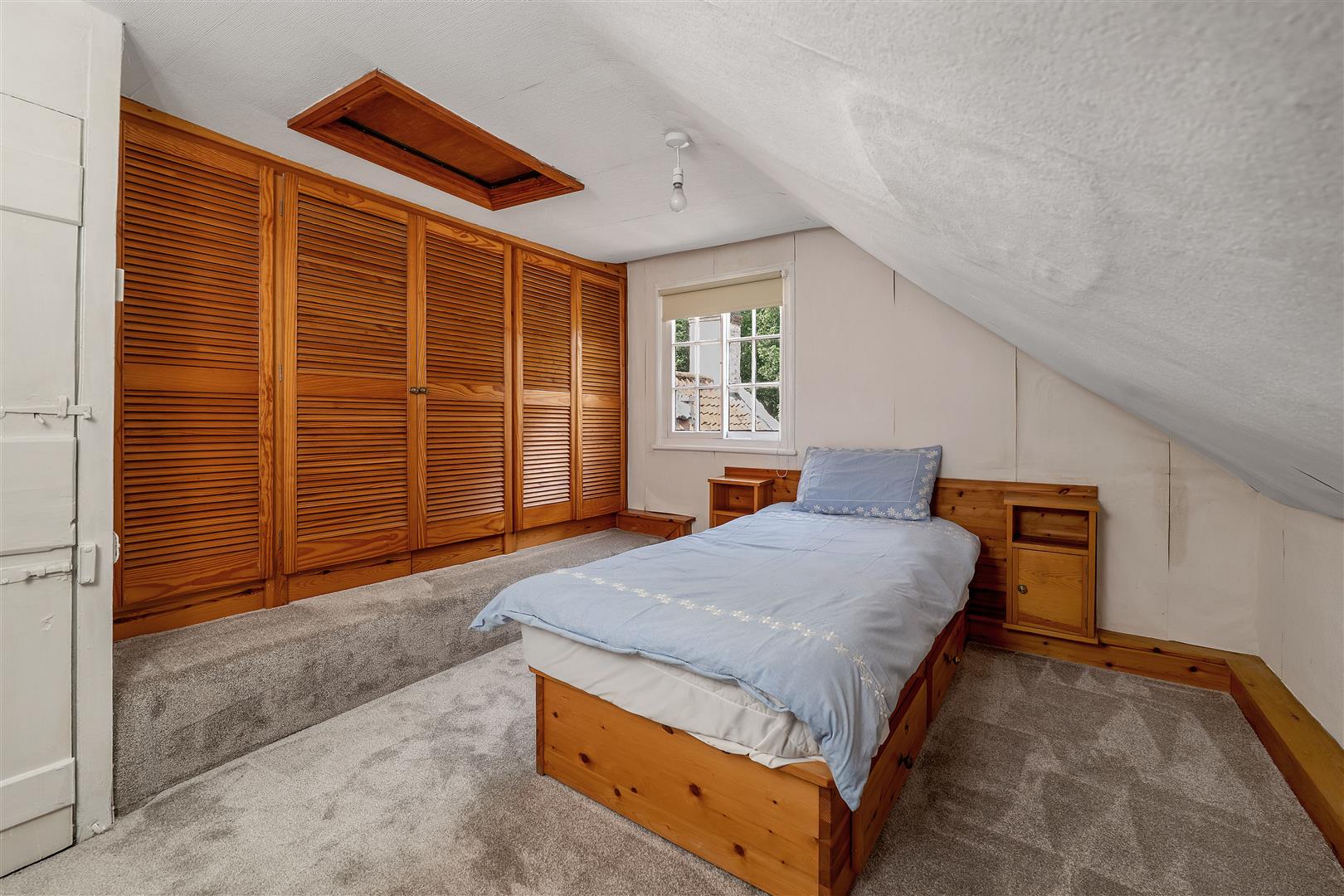Three box sash windows, hob fireplace, fitted wardrobes and radiator.