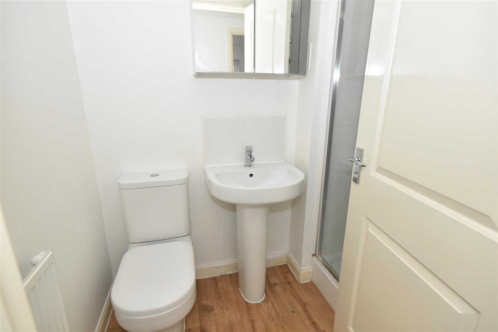Wc - With a modern white suite comprising low suite WC and a corner pedestal wash hand basin, extractor fan, radiator. Wall mounted electric consumer unit.