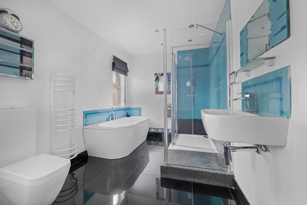 Family Bathroom - 3.86m x 2.31m (12'8 x 7'7) - Built in cupboard housing Ideal combination gas fired central heating boiler. Modern white bathroom suite comprising wash hand basin, WC, bidet, panelled bath, double shower with tray, glass shower screen and flipper door, tiled walls, wall mounted overhead rain head and hand shower. Gloss finish black ceramic tiled floor, radiator, designer heated towel radiator.