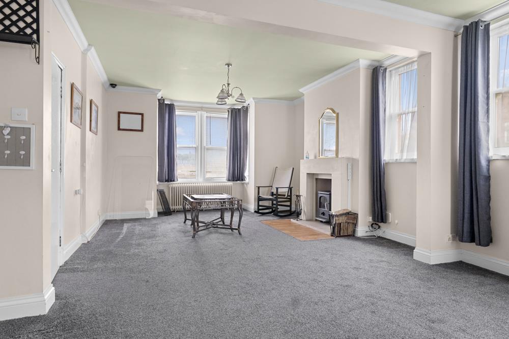 Living Room - 9.04m x 4.45m (29'8 x 14'7) - Walk in cupboard under stairs, walk in bay with uPVC double glazed sash window to the front and uPVC double glazed sash window to rear elevation. Two radiators, limestone fireplace housing wood burning stove.
