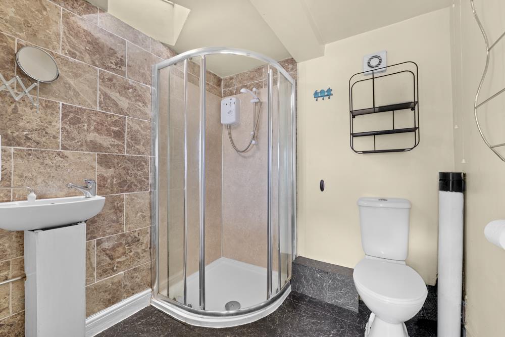 En-Suite Shower - 2.21m x 1.83m (7'3 x 6') - White suite comprising low suite WC, stainless steel wash hand basin with mixer tap, water heater and tap. Tiled shower cubicle with screen door. Wall mounted Bristan electric shower, extractor fan, Velux roof light.